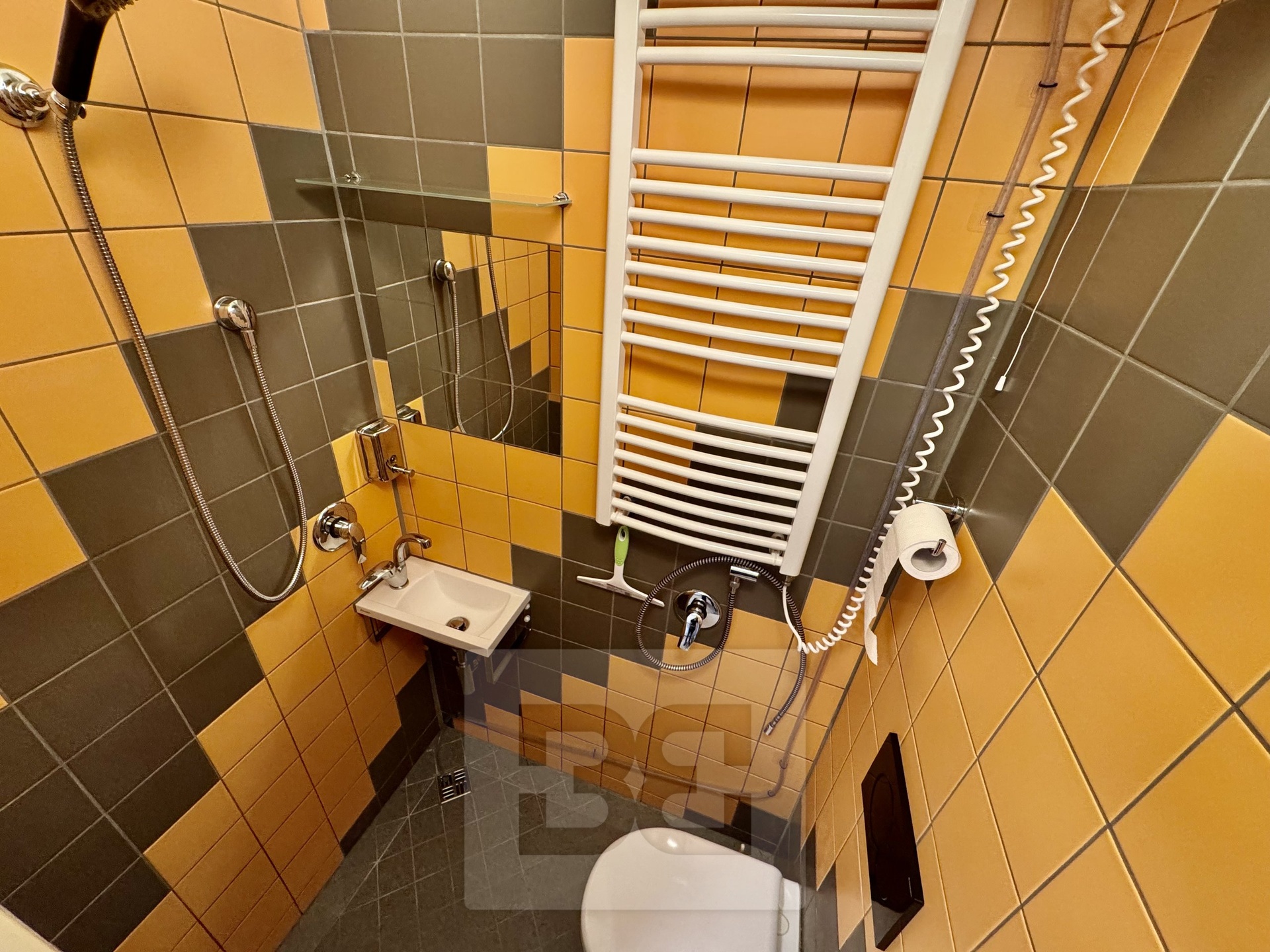 Koupelna je se sprchovým koutem, WC a bojlerem – je spíše menší, nicméně funkčně řešená.