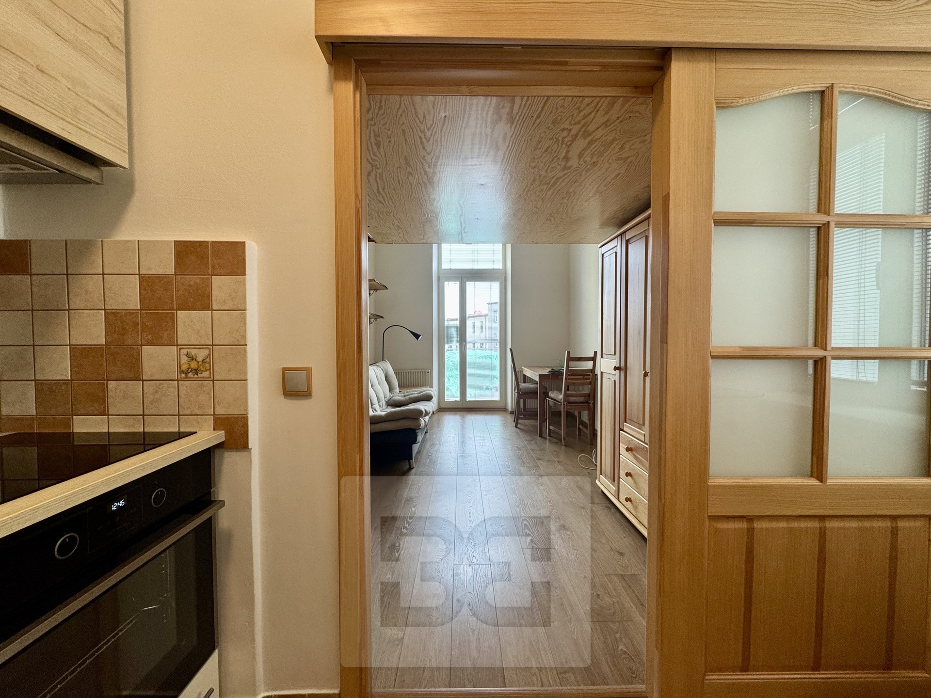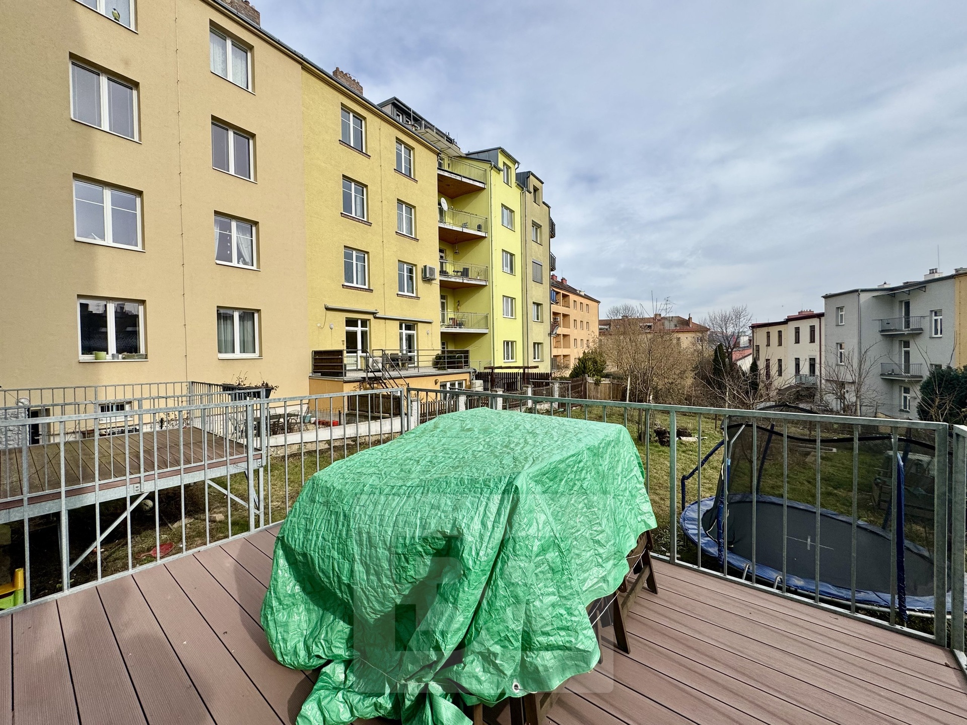 Velkým benefitem bytu je terasa orientovaná do zahrady, která nabízí klidné posezení mimo ruch ulice.