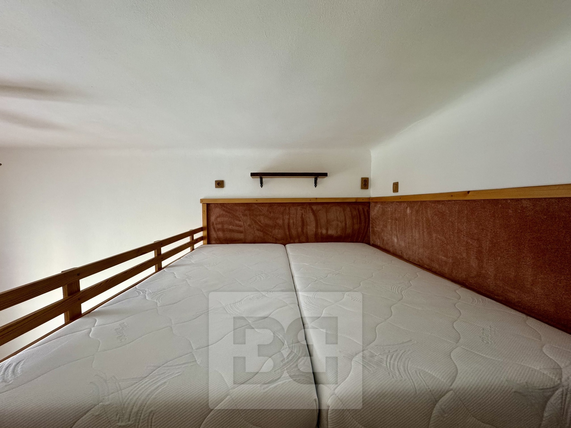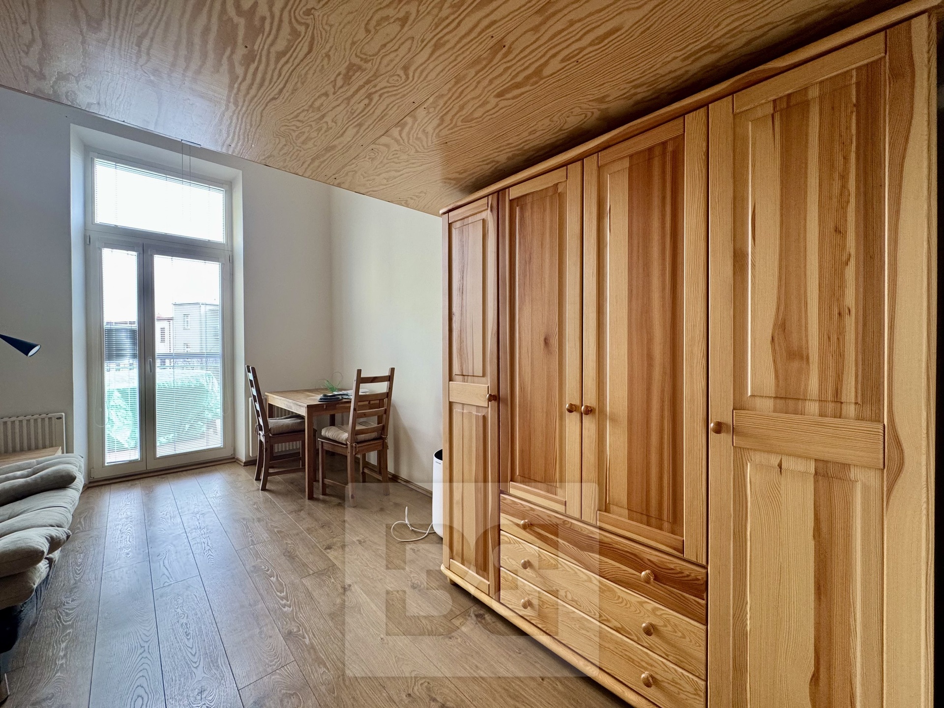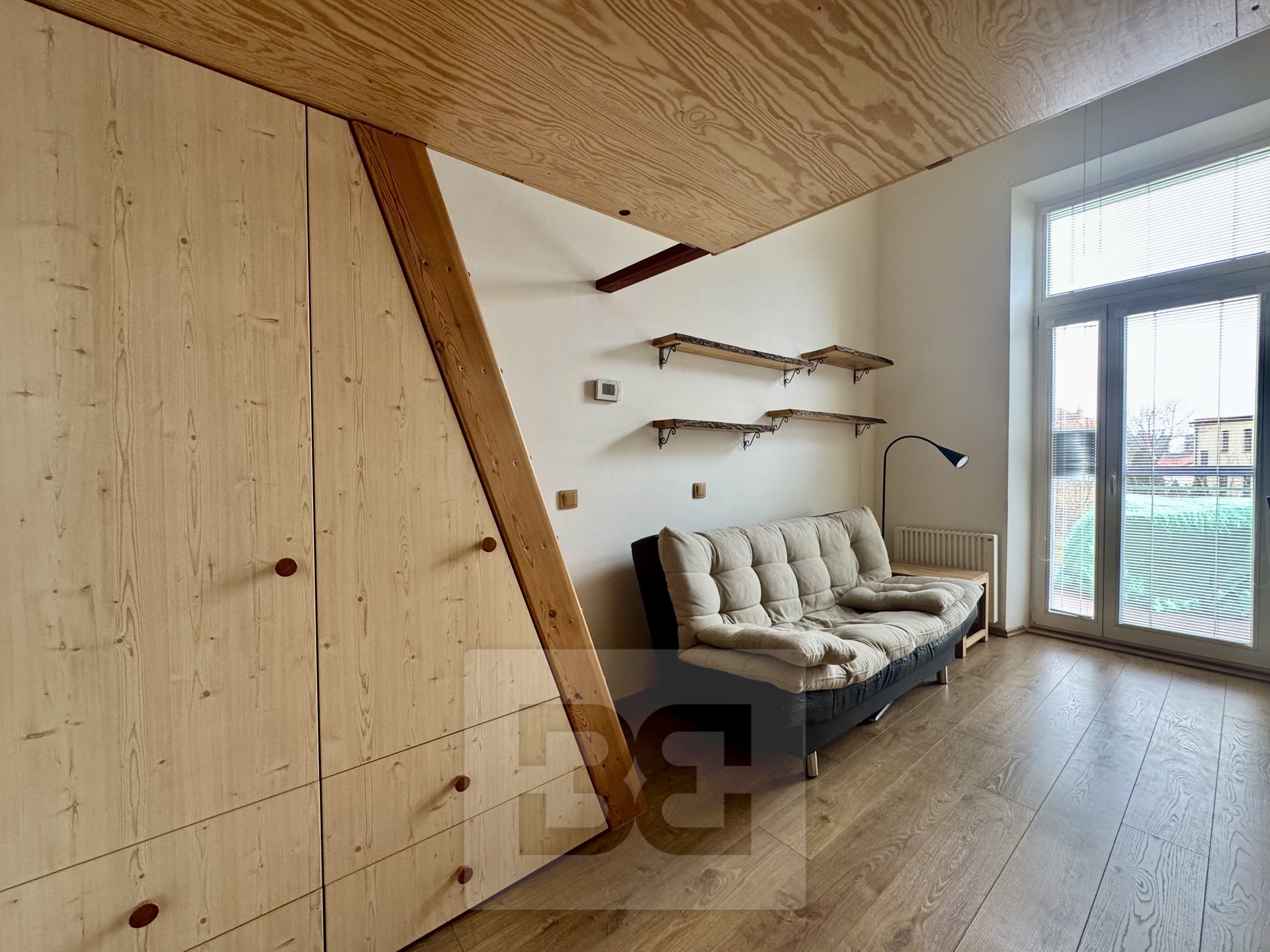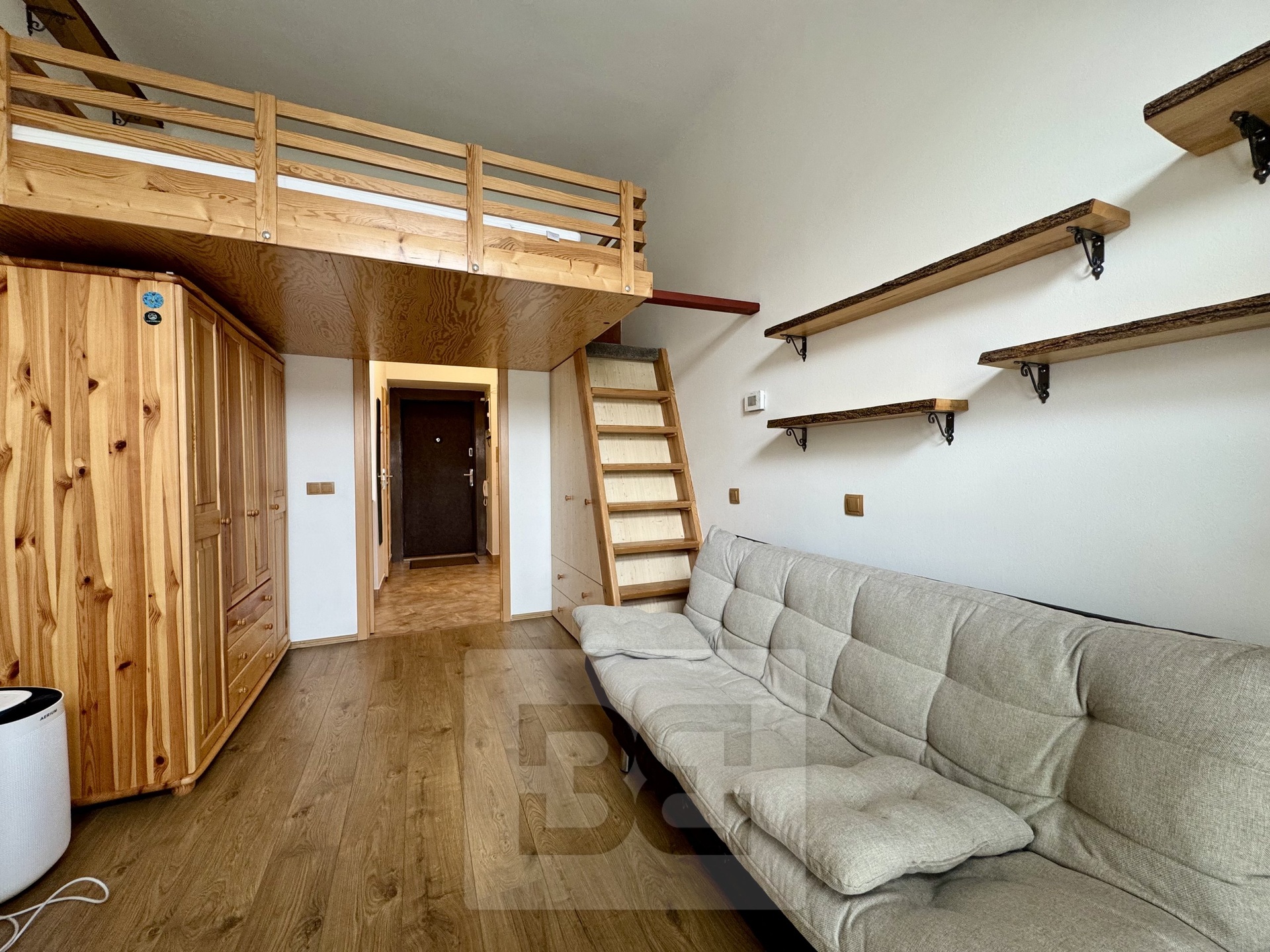 Dispozice bytu nabízí obytný prostor s loftovým patrem na spaní, kde je umístěna postel s novými matracemi. V pokoji se dále nachází gauč a stůl, což vytváří příjemné zázemí pro bydlení i práci z domova. Plně vybavená kuchyně poskytuje vše potřebné pro pohodlné vaření.
