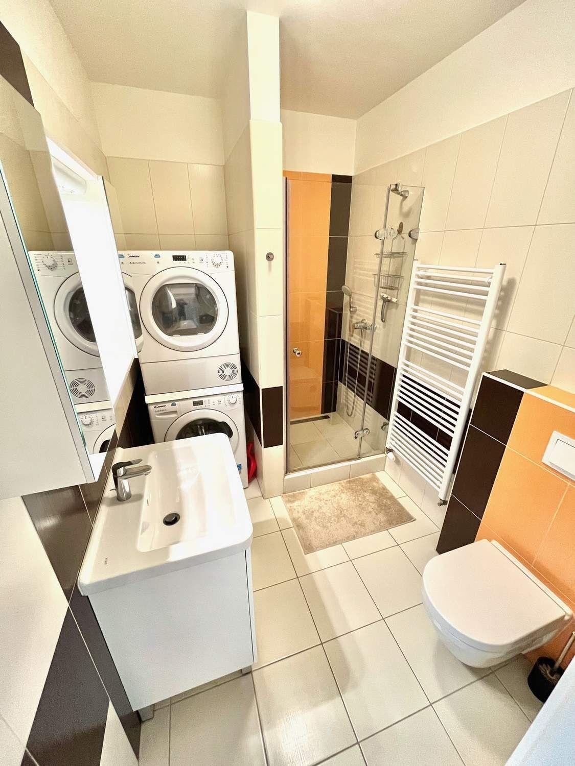 Koupelna se sprchovým koutem a WC s pračkou a sušičkou.