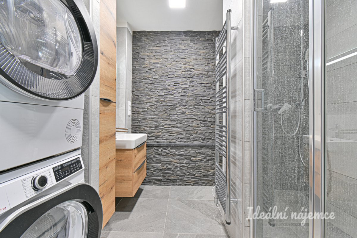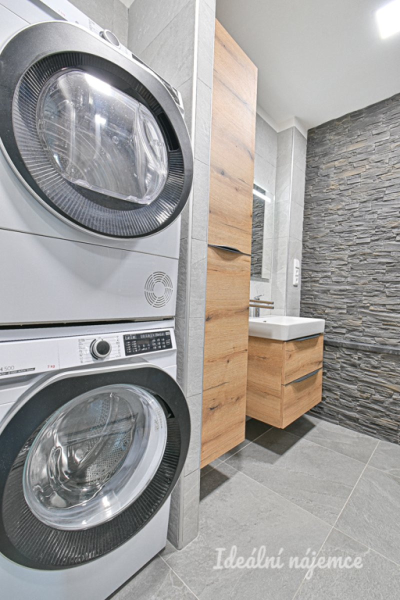Byt se nabízí vybavený. Kuchyně disponuje lednicí, myčkou, elektrickou troubou, varnou deskou, mikrovlnnou troubou a digestoří. Obývací část je zařízena pohovkou, konferenčním stolem a knihovnou. V koupelně je sprchový kout, umyvadlo, pračka, sušička a toaleta.