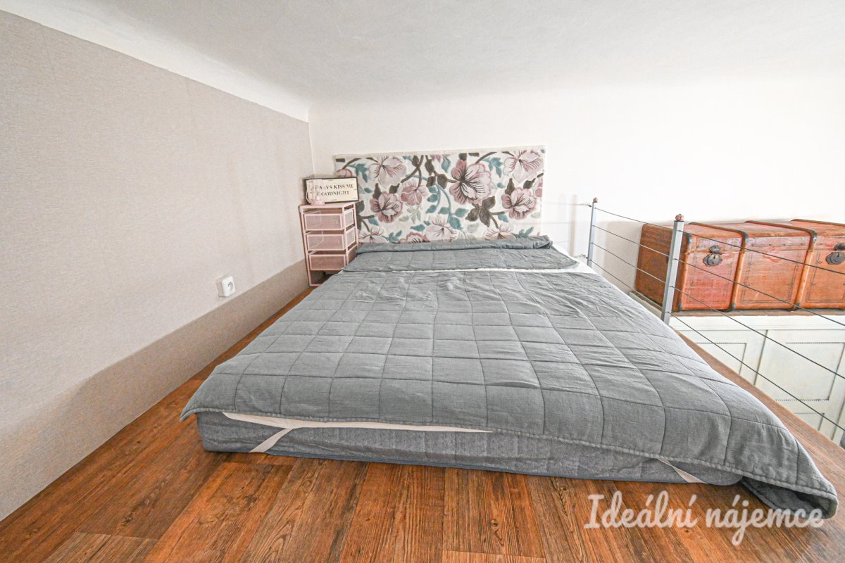 Byt se nabízí plně vybavený. Kuchyně elektrickou troubou, varnou deskou, lednicí, pračkou a digestoří. Obývací část disponuje pohovkou, šatními skříněmi, jídelním stolem se židlemi. Díky vysokým stropům je spací část vyřešena na patře. V koupelně je sprchový kout, toaleta a umyvadlo.