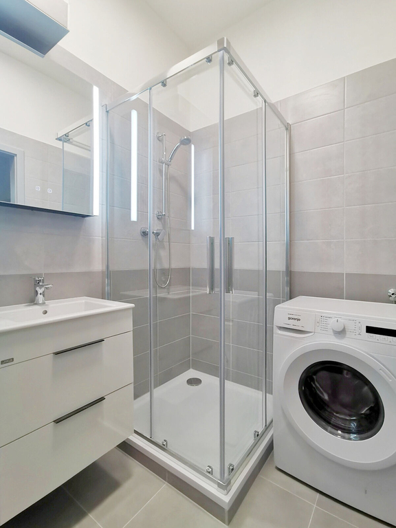 Byt je vybavený kuchyňskou linkou se sklokeramickou varnou deskou, troubou, MW troubou, dřezem, digestoří, osvětlením - a dále lednicí a pračkou. Na podlahách plovoucí podlaha a dlažba, koupelna se sprchovým koutem a WC.