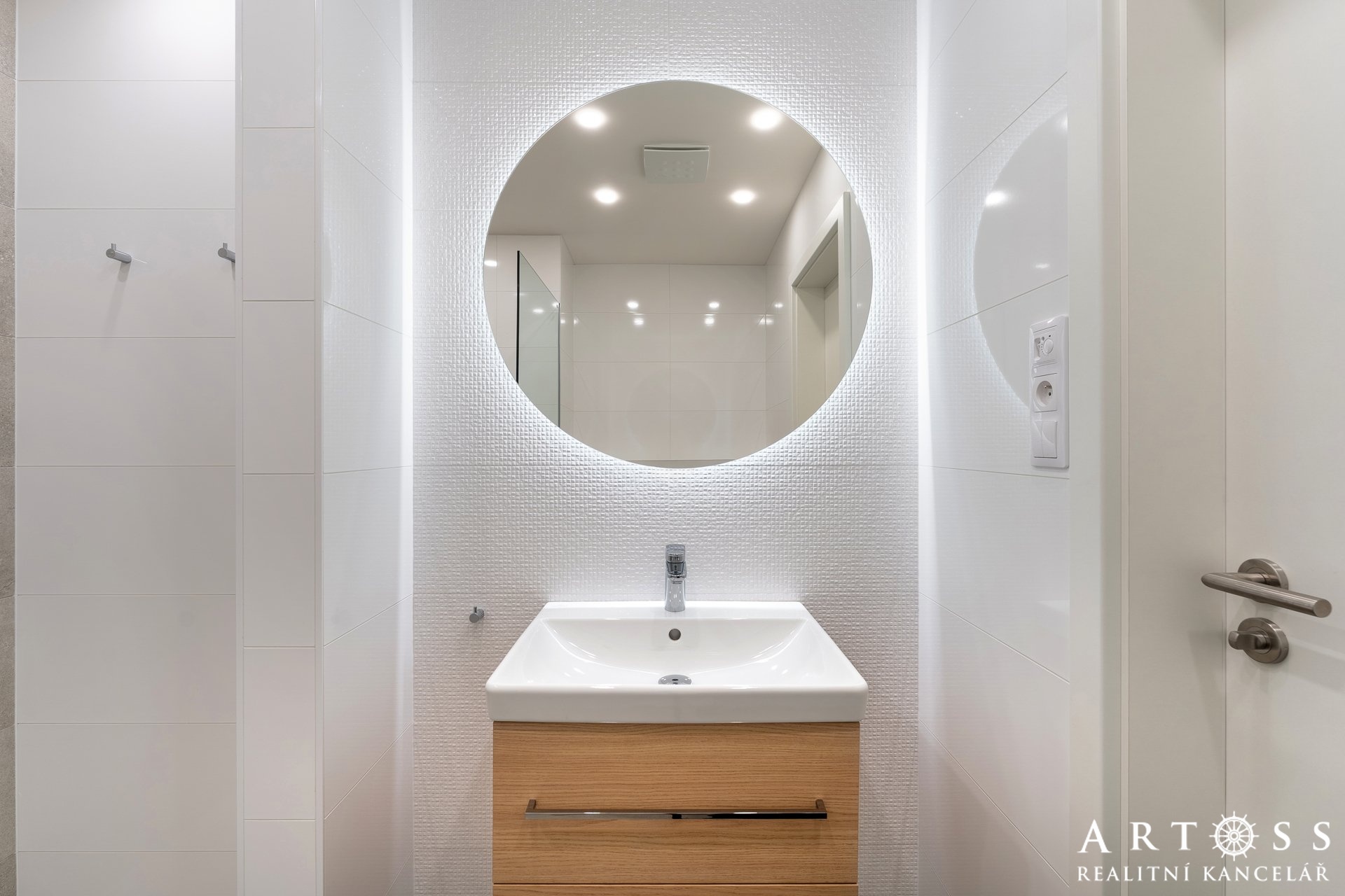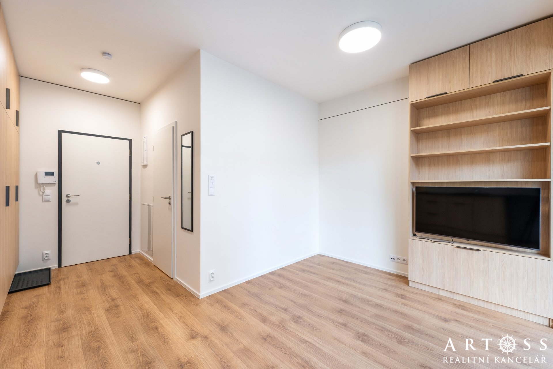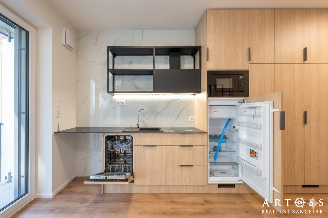 Byt je vybavený: kuchyňská linka s dostatkem úložných prostor, indukční deska, myčka, pračka, mikrovlnná trouba, předokenní rolety, rekuperace. Vhodné pro jednotlivce nebo pár.