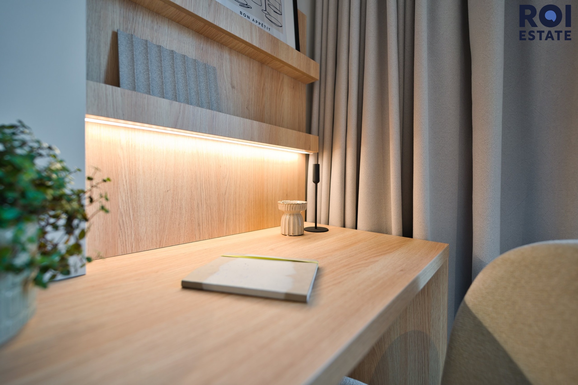 Při vstupu do pokoje vás zaujme velké okno, tedy dostatek světla a opravdu mnoho velmi dobře navržených úložných míst. Kuchyňská linka na míru s vestavěnými spotřebiči. Pracovní kout v stejném designu. A co říkáte na postel?