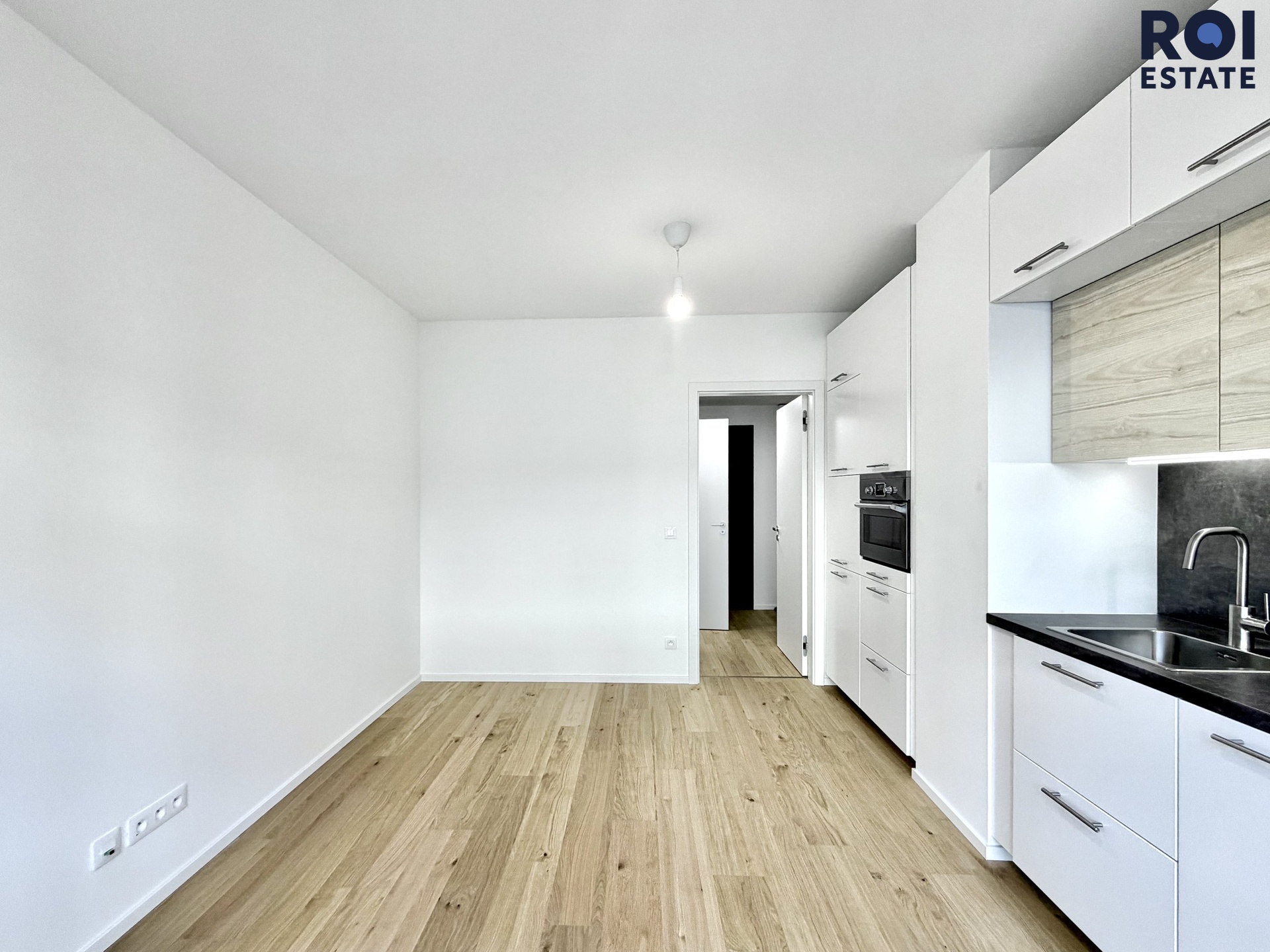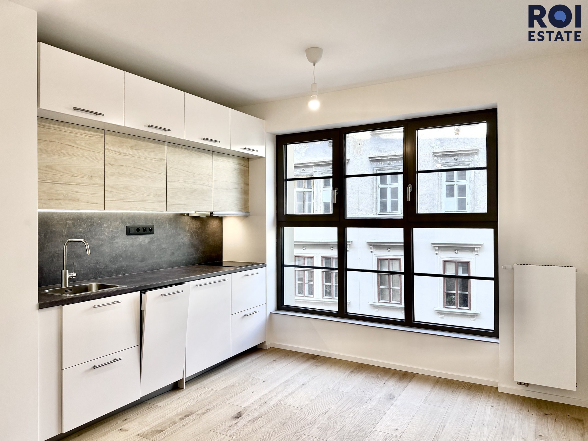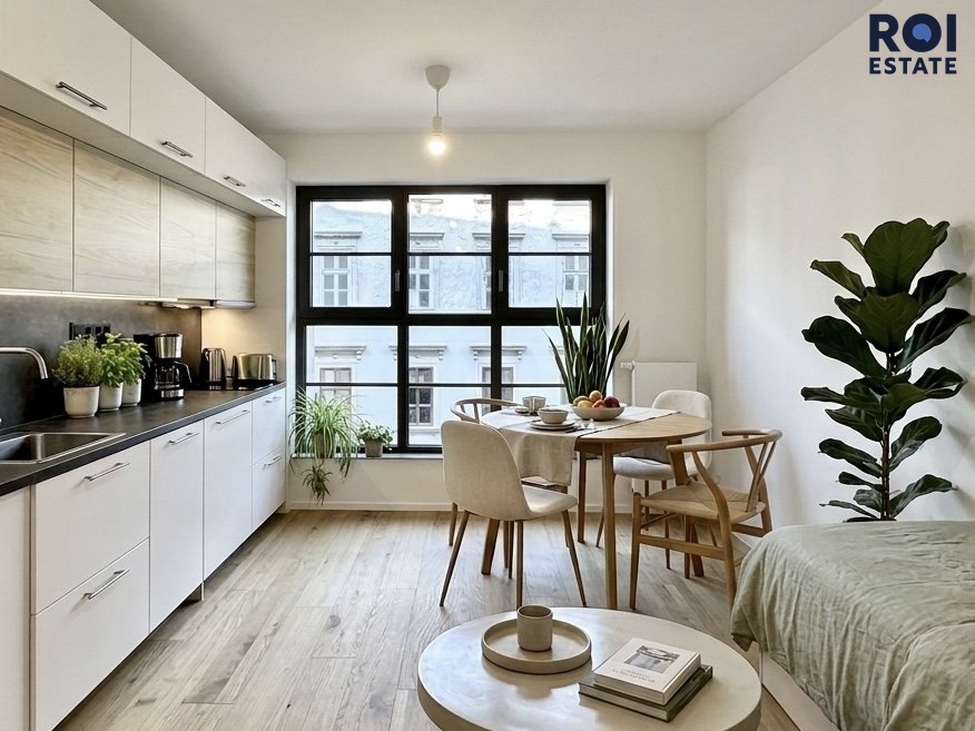Vstupte do světa čistého designu a moderního pohodlí. Ateliér o výměře 23 m² se nachází ve 3. patře s výtahem a je připraven stát se vaším novým domovem nebo inspirativním pracovním prostorem. Srdcem hlavní místnosti je luxusní kuchyňská linka na míru v kombinaci bílé barvy a dekoru dřeva, doplněná o elegantní tmavou pracovní desku. Kuchyně je plně vybavena špičkovými vestavnými spotřebiči včetně trouby, varné desky, digestoře, dřezu, vestavné lednice s mrazákem a nechybí ani praktická myčka nádobí a pračka.