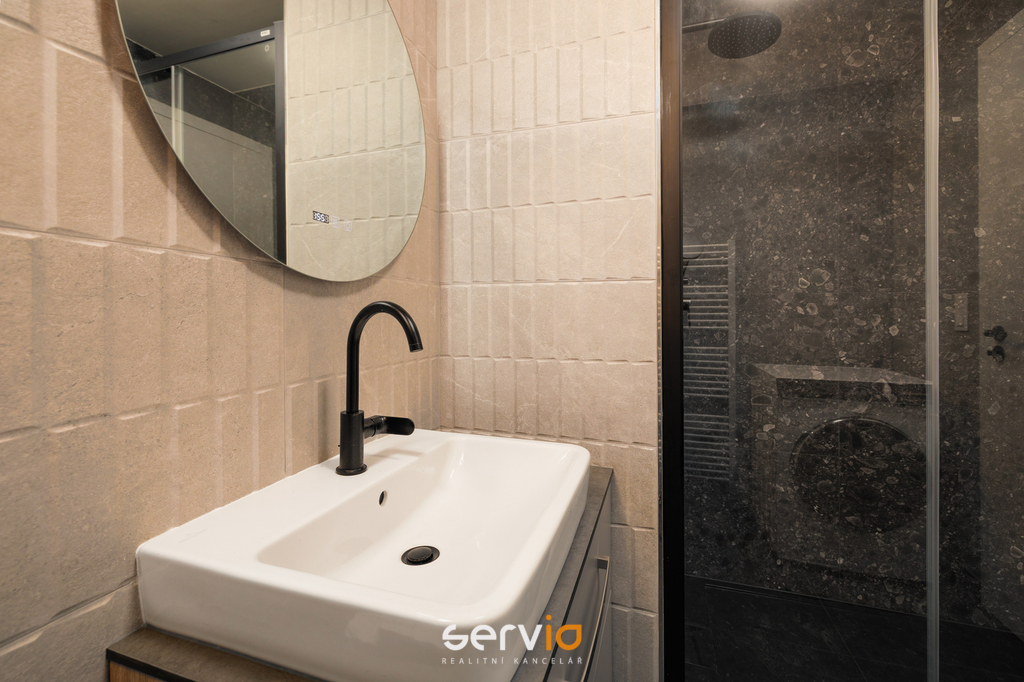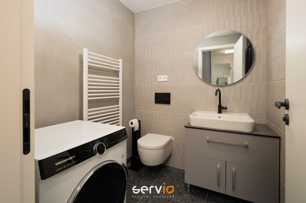 Koupelna v elegantním designu nabízí toaletou, prostorný sprchový kout, úložné skříňky, osvětlené zrcadlo s možností volby barvy světla, antifog úpravou a zabudovanými hodinami. K dispozici je také pračka se sušičkou.