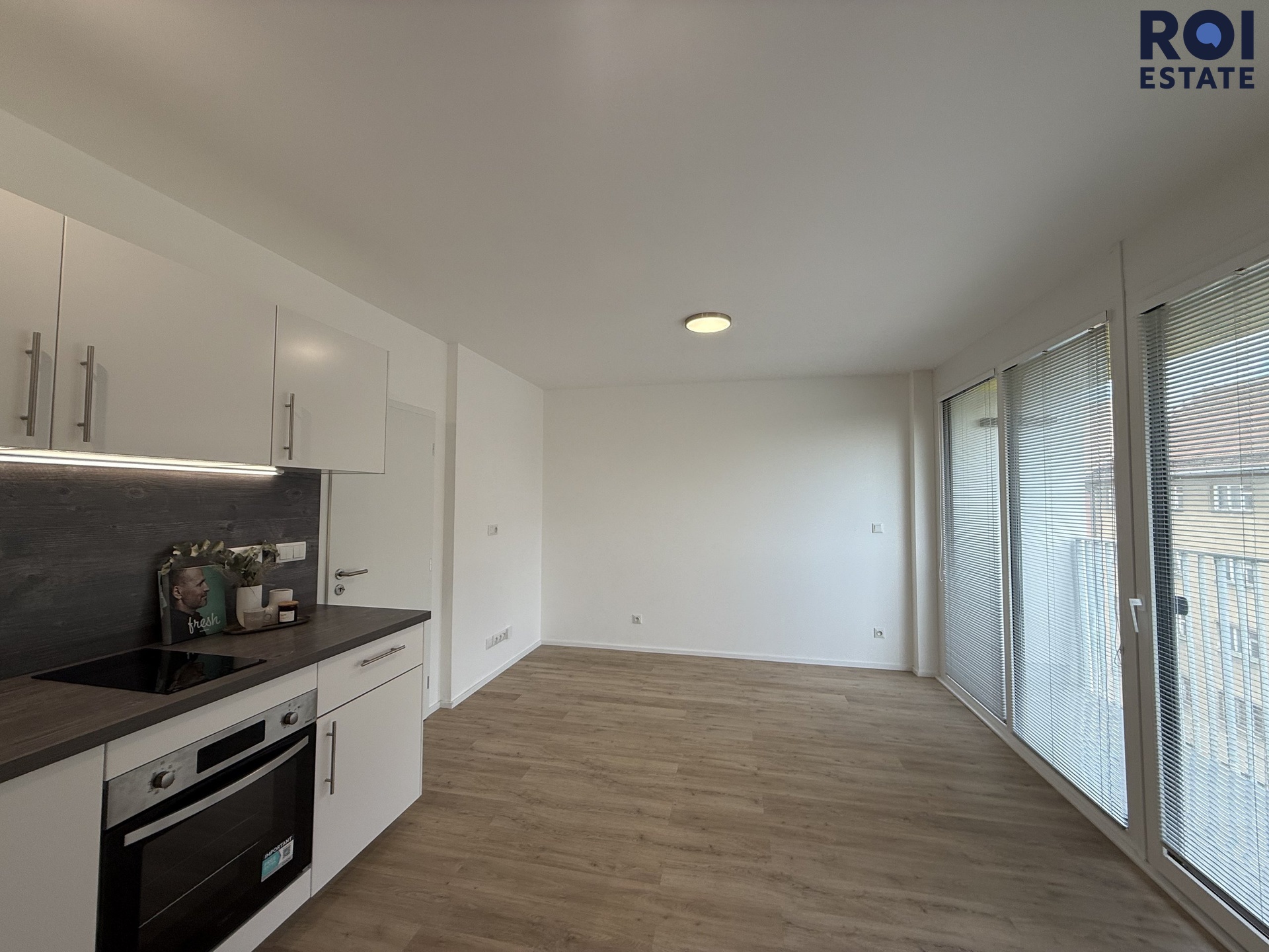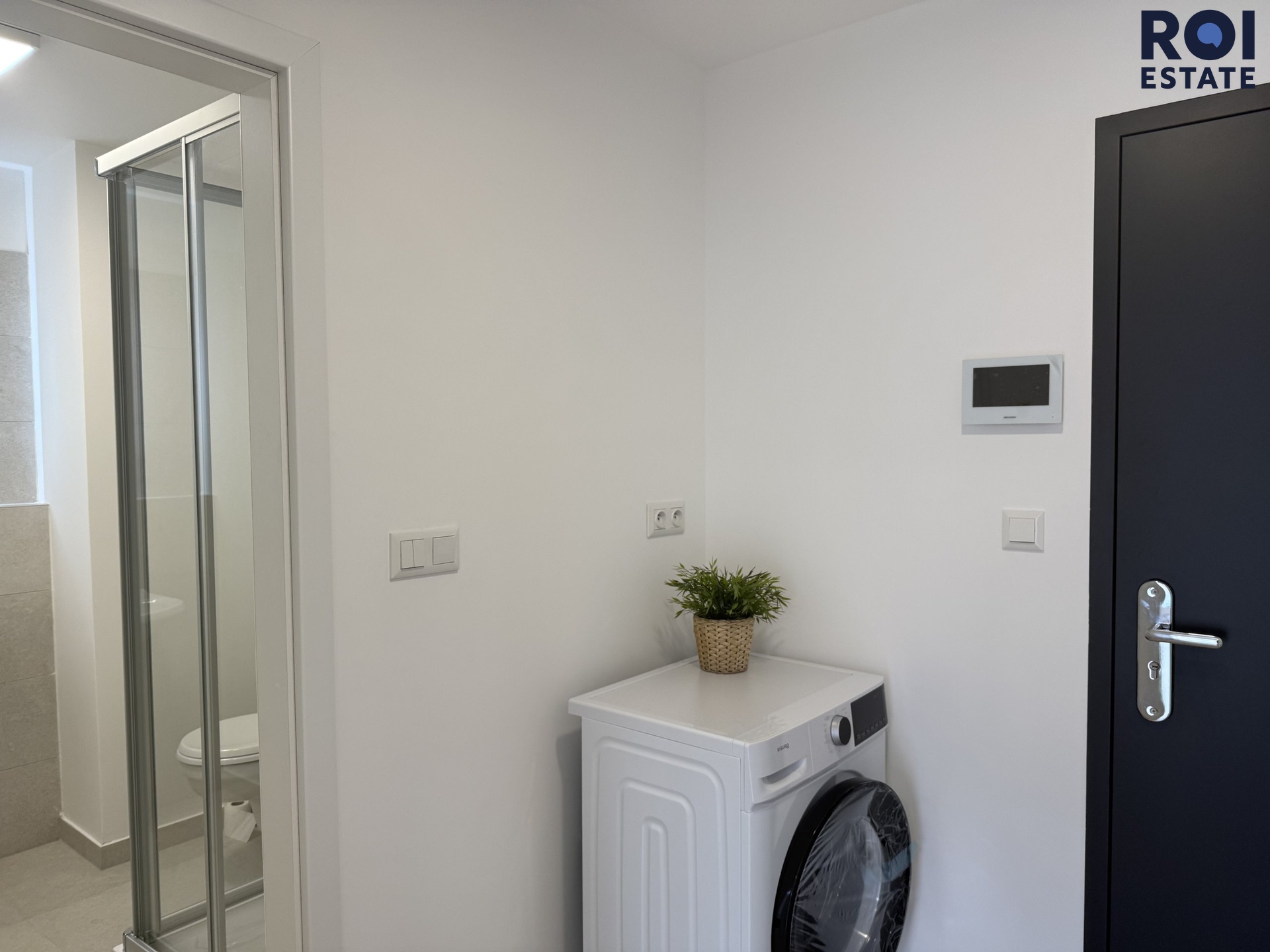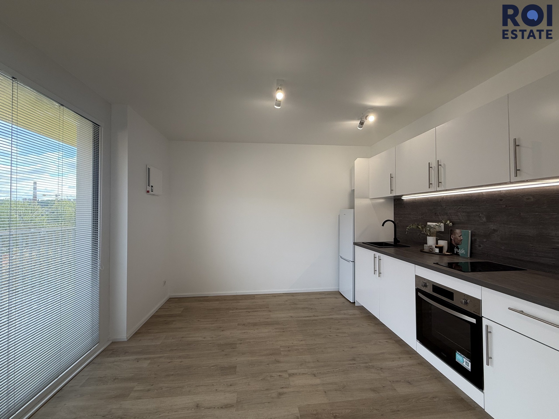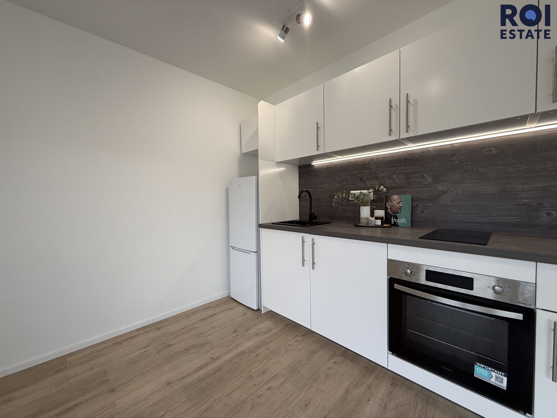 Byt nabízí vstupní předsíň s prostorem pro šatní řešení, moderní koupelnu se sprchovým koutem a hlavní obytný prostor s kuchyňskou linkou vybavenou elektrickou varnou deskou, troubou, lednicí a pračkou.