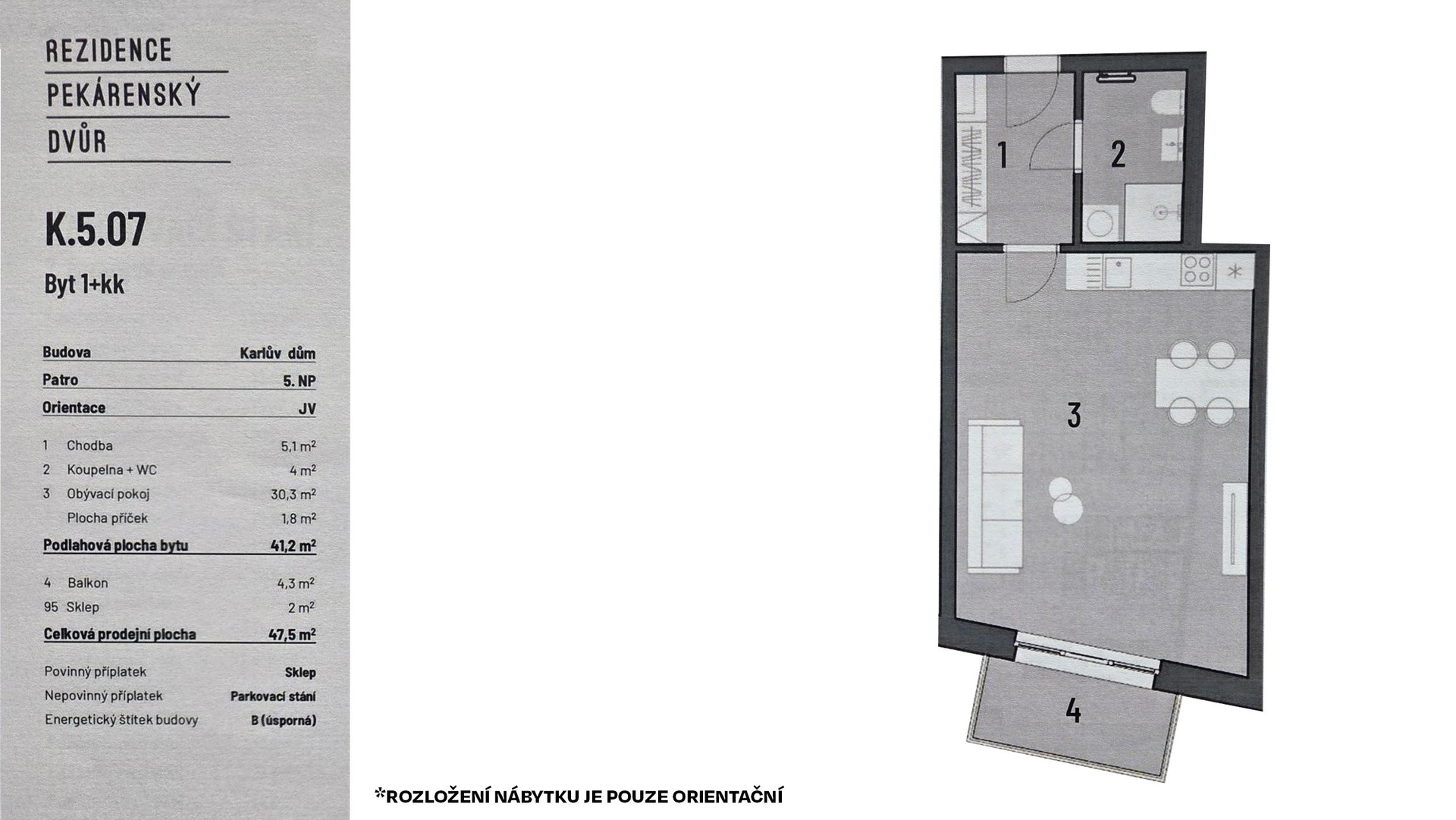 Celková plocha činí 47,5 m² + balkon 4,3 m² a sklepní kóje 2 m². Dispozice je řešena prakticky: obývací pokoj s kuchyňským koutem (30,3 m²), koupelna (4 m²) a vstupní chodba (5,1 m²). Z obývací části je přímý vstup na balkon. Interiér je kompletně zařízen nábytkem i spotřebiči, působí vzdušně, čistě a nadčasově.