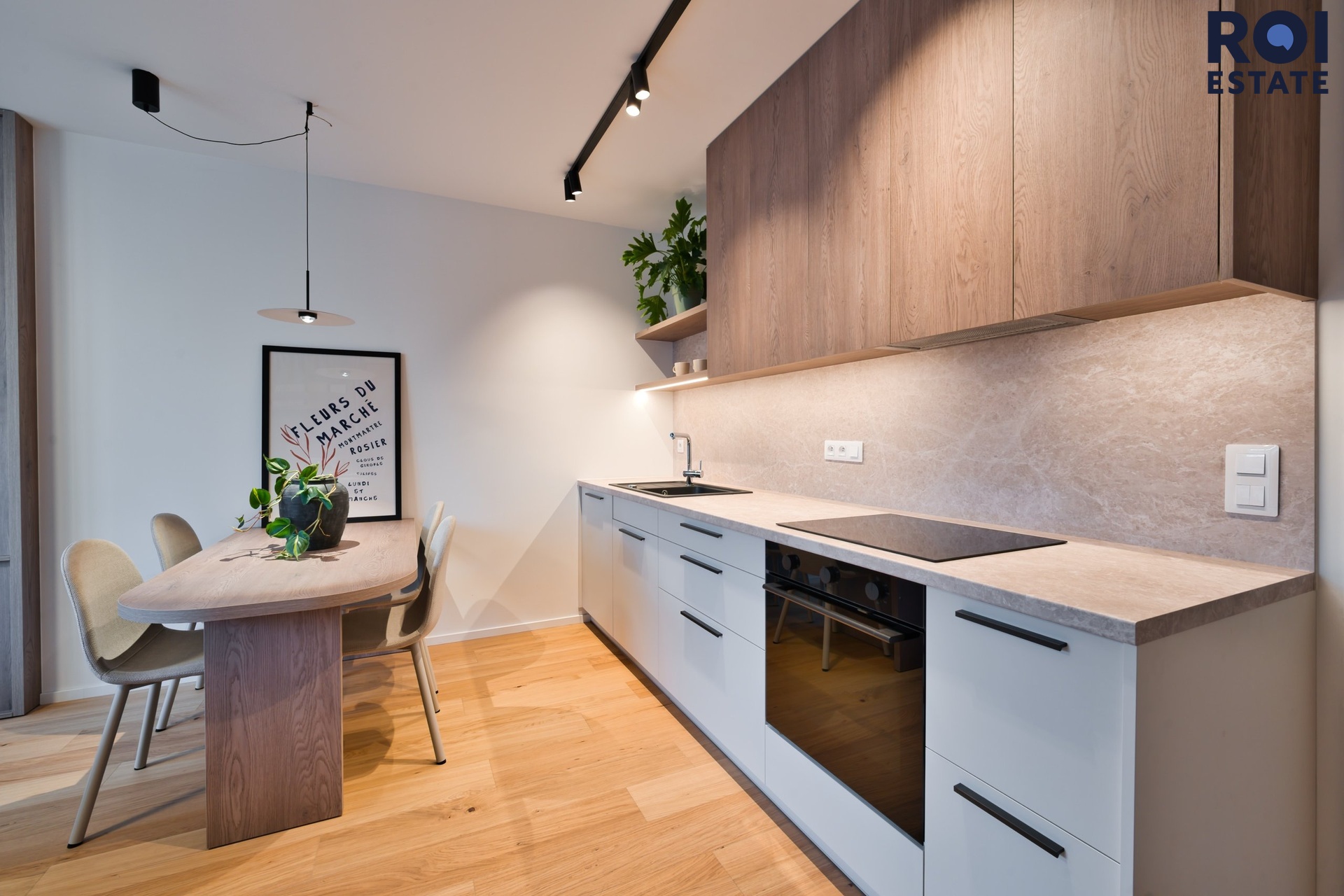 Kuchyně a jídelní část - Designová kuchyňská linka působí luxusně, ale zároveň prakticky. Krásné dřevěné horní skříňky, čisté linie, světla v teplém tónu a dostatek místa na vaření i stolování díky masivnímu jídelnímu stolu.