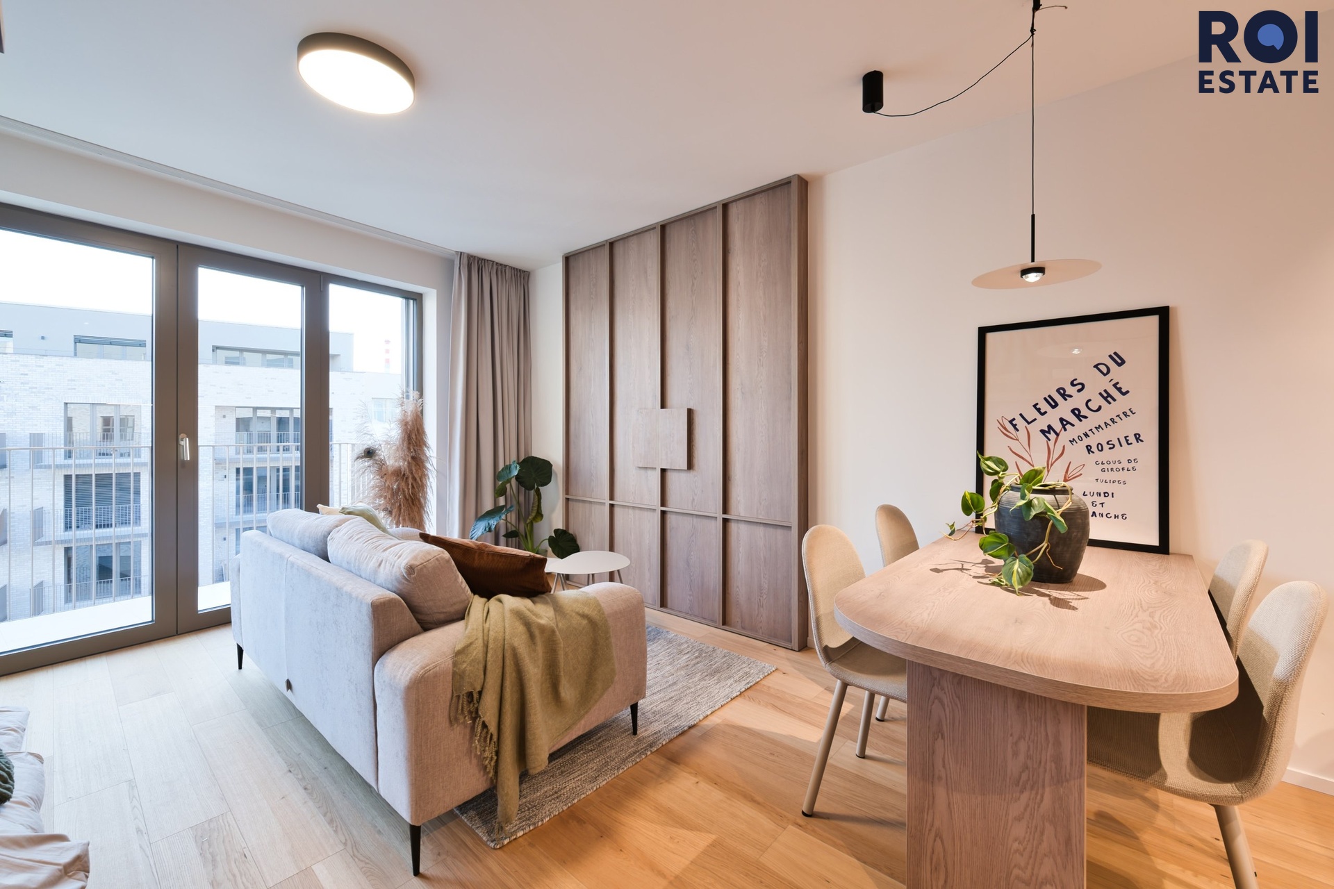 Obývací část s přirozeným světlem, velká francouzská okna zaplavují prostor denním světlem a vedou na příjemný balkon orientovaný do vnitrobloku, kde si můžete vychutnat ranní slunce i večerní klid.