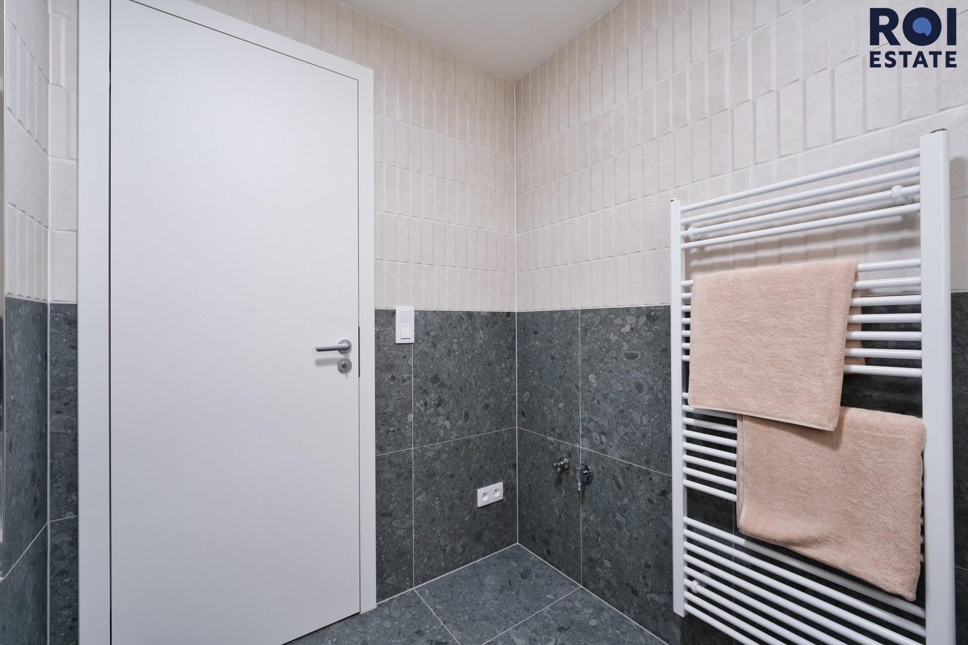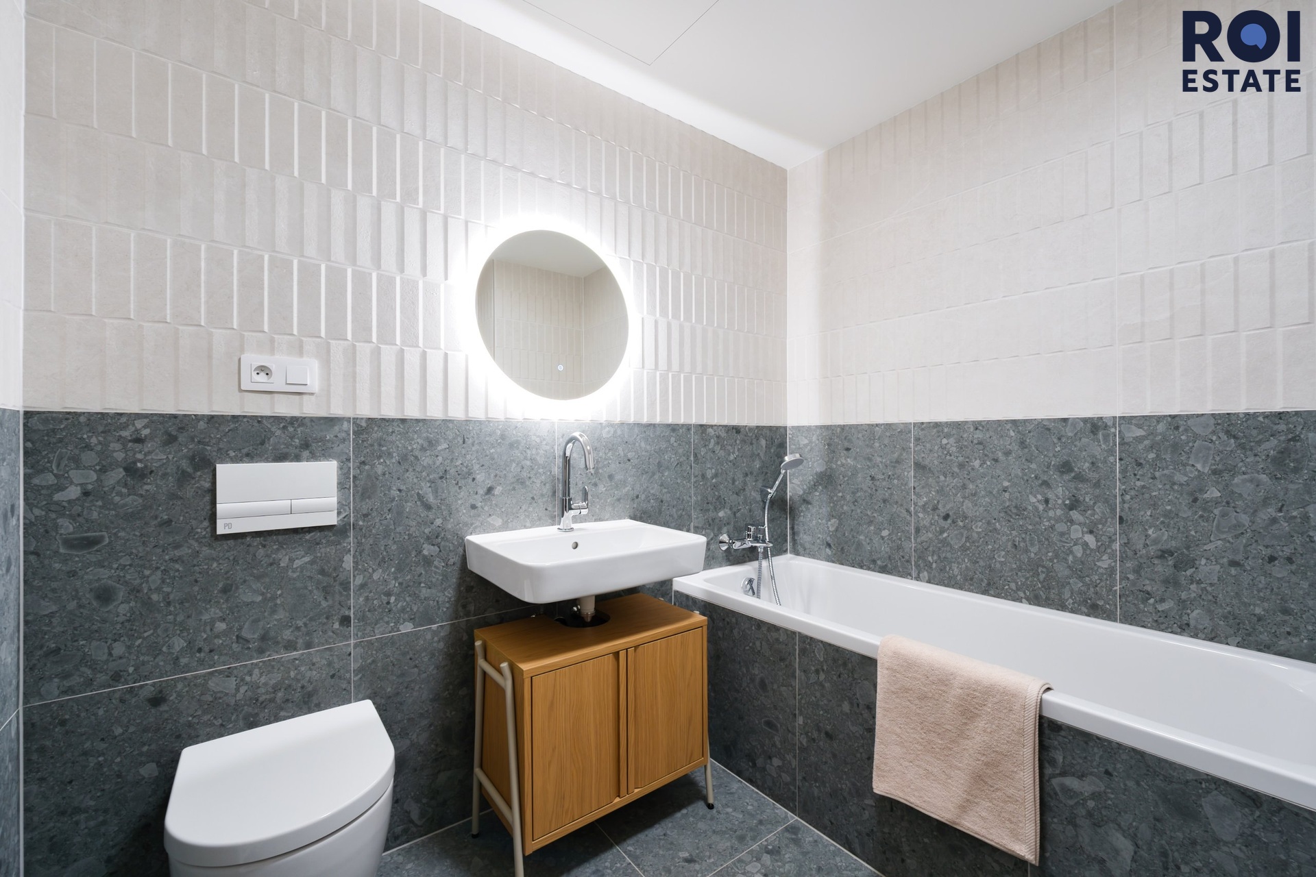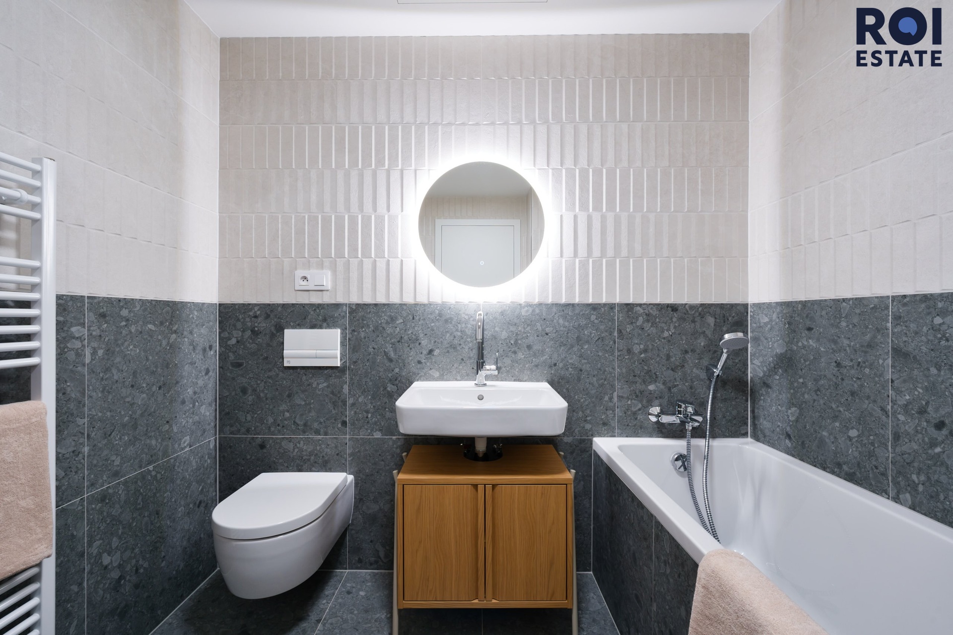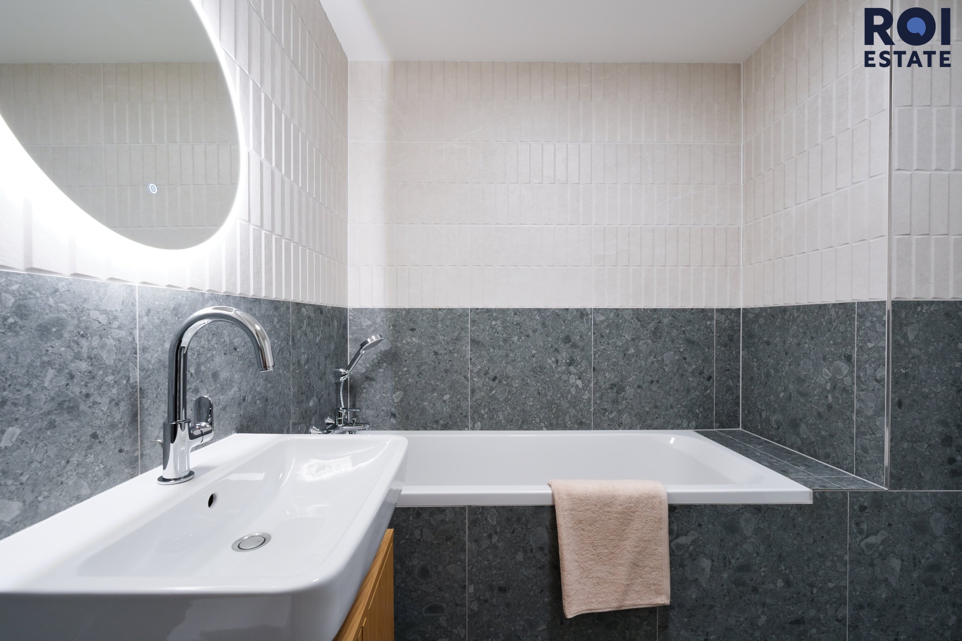 Koupelna jako malé spa - Koupelna překvapí svou velikostí i zpracováním – velkoformátové šedé obklady v kombinaci s krémovou barvou, zabudované LED zrcadlo, vana a také zde bude pračka se sušičkou.
