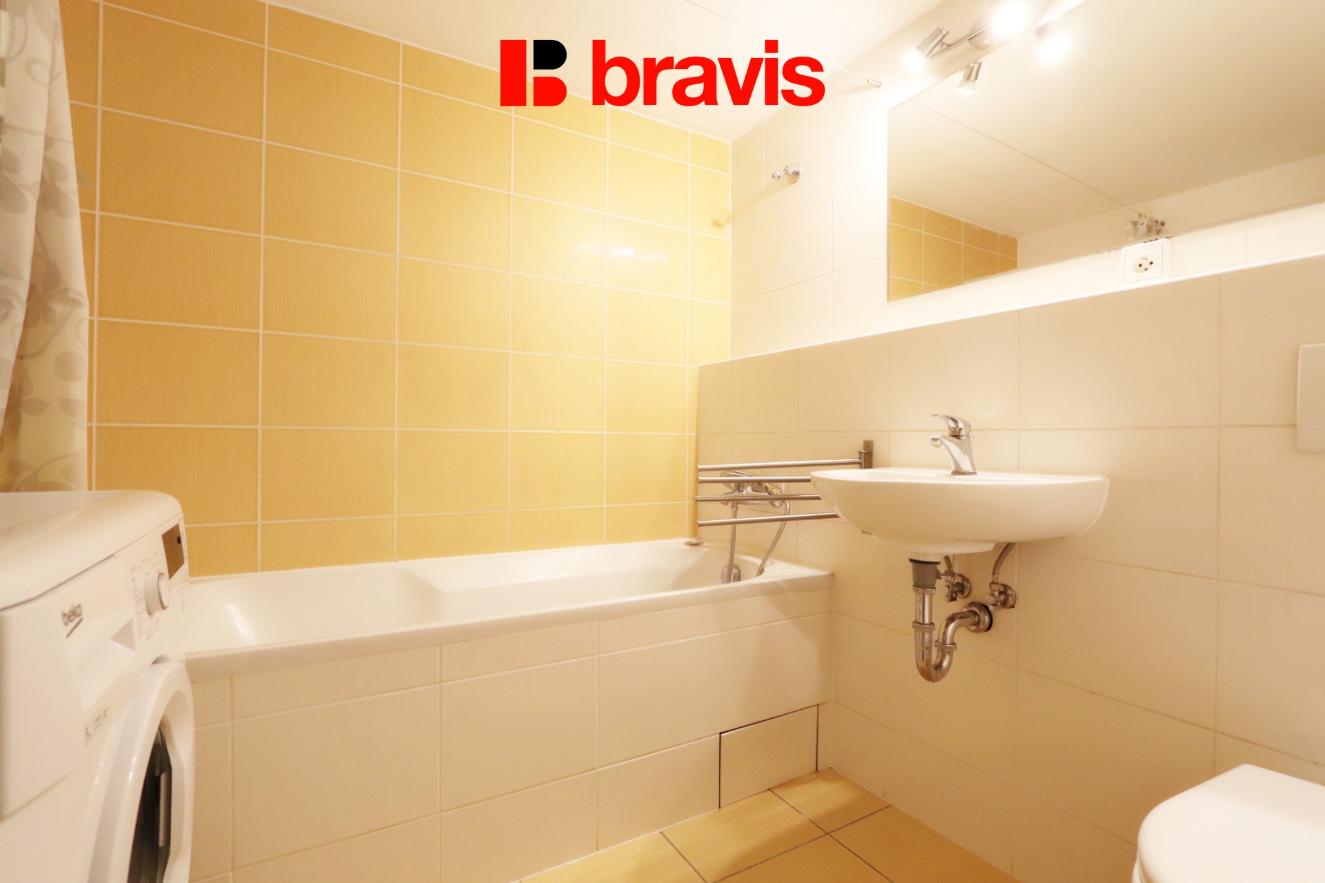 Koupelna je vybavena vanou, umyvadlem, zrcadlem, toaletou a pračkou.