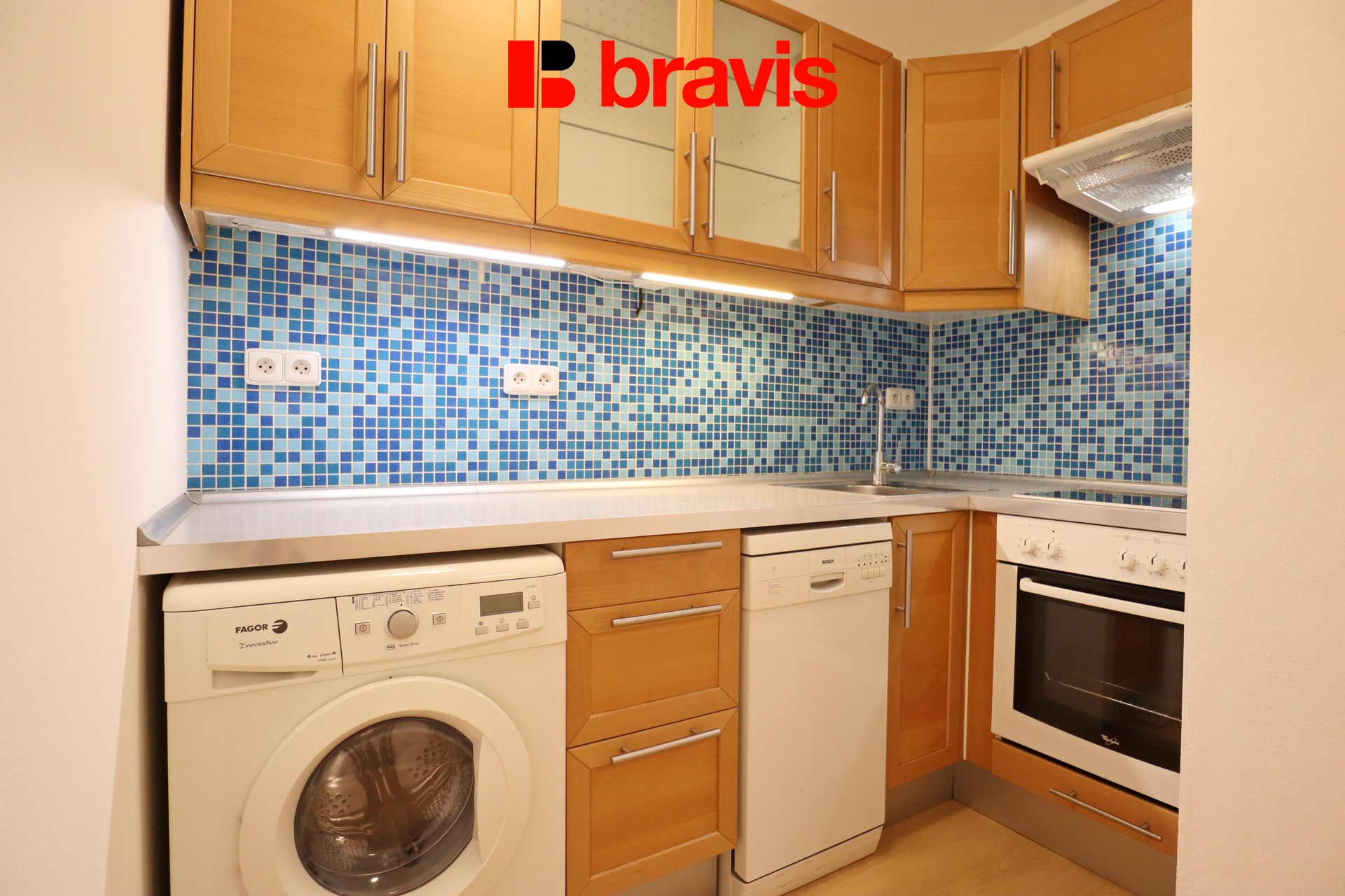 Kuchyňský kout: Kuchyňská linka včetně vestavěných spotřebičů (sklokeramická varná deska, elektrická trouba, digestoř, myčka, pračka).