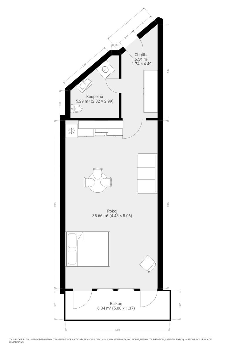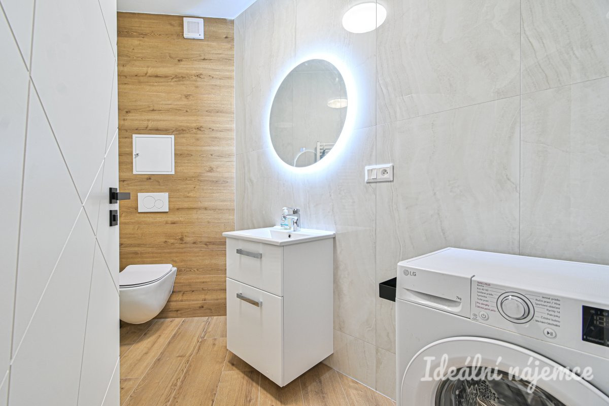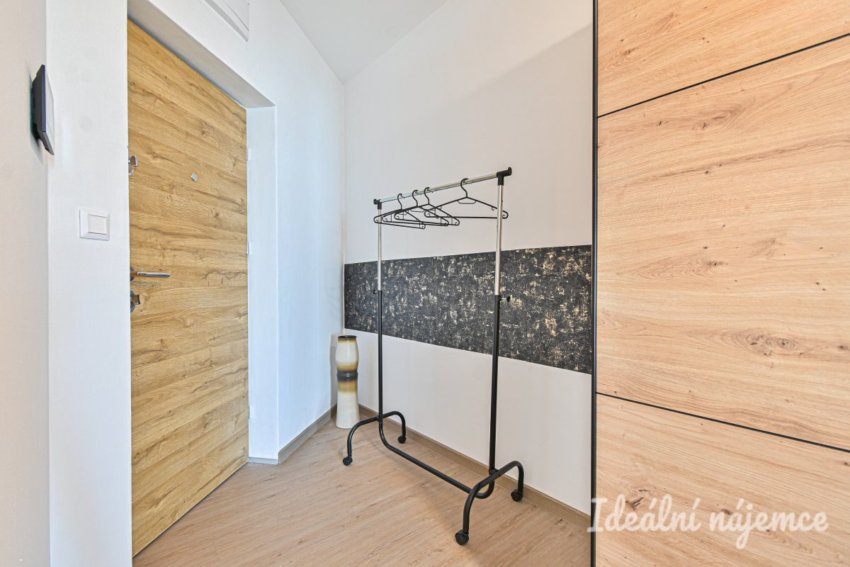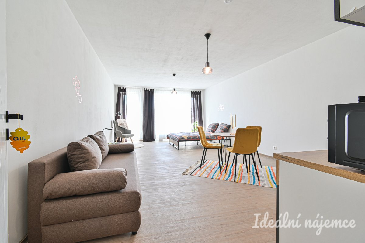 Byt se nabízí vybavený dle fotografií. Hlavní obytný prostor je světlý a vzdušný, propojený s kuchyňským koutem, který disponuje základními spotřebiči. Koupelna je moderně řešená, součástí je sprchový kout, umyvadlo, pračka a toaleta. V bytě je také dostatek úložného prostoru.