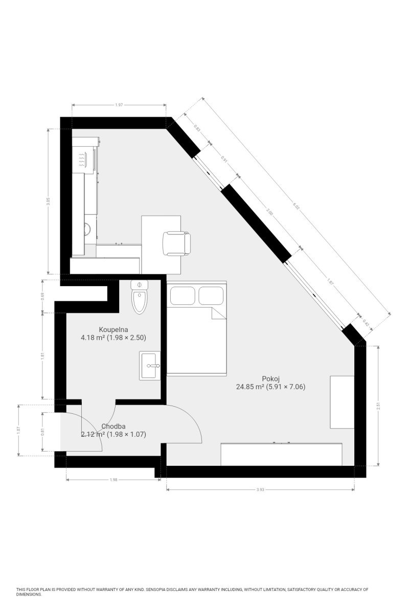 Byt se nabízí vybavený dle fotografií. Kuchyňská linka je vybavena spotřebiči a součástí hlavního prostoru je také jídelní stůl, postel a úložné prostory. Koupelna disponuje sprchovým koutem, umyvadlem a toaletou. Součástí bytu je také předsíň s úložným prostorem.