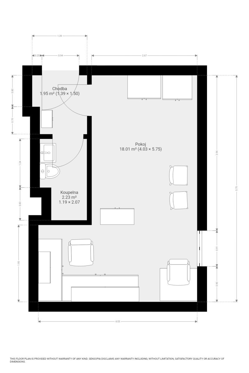 V obytné části se nachází pohovka, pracovní stůl se židlí, barový stůl s židlemi, komody a televize. Koupelna je nová a moderně řešená, se sprchovým koutem, umyvadlem a toaletou.