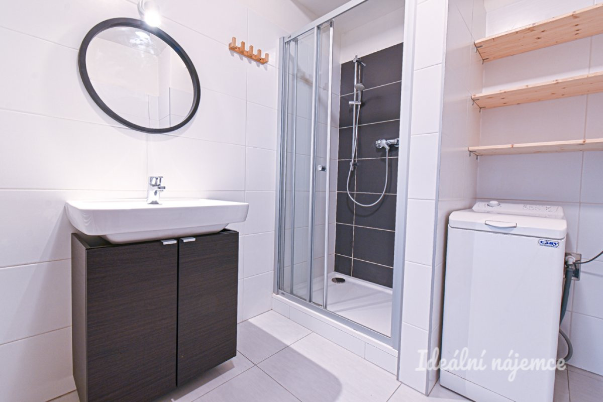 Byt se nabízí vybavený. Kuchyňská linka disponuje troubou, indukční deskou s digestoří a lednicí. Toaleta je součástí koupelny, k dispozici je pračka umístěna rovněž v koupelně. Z pokoje je východ na předzahrádku.