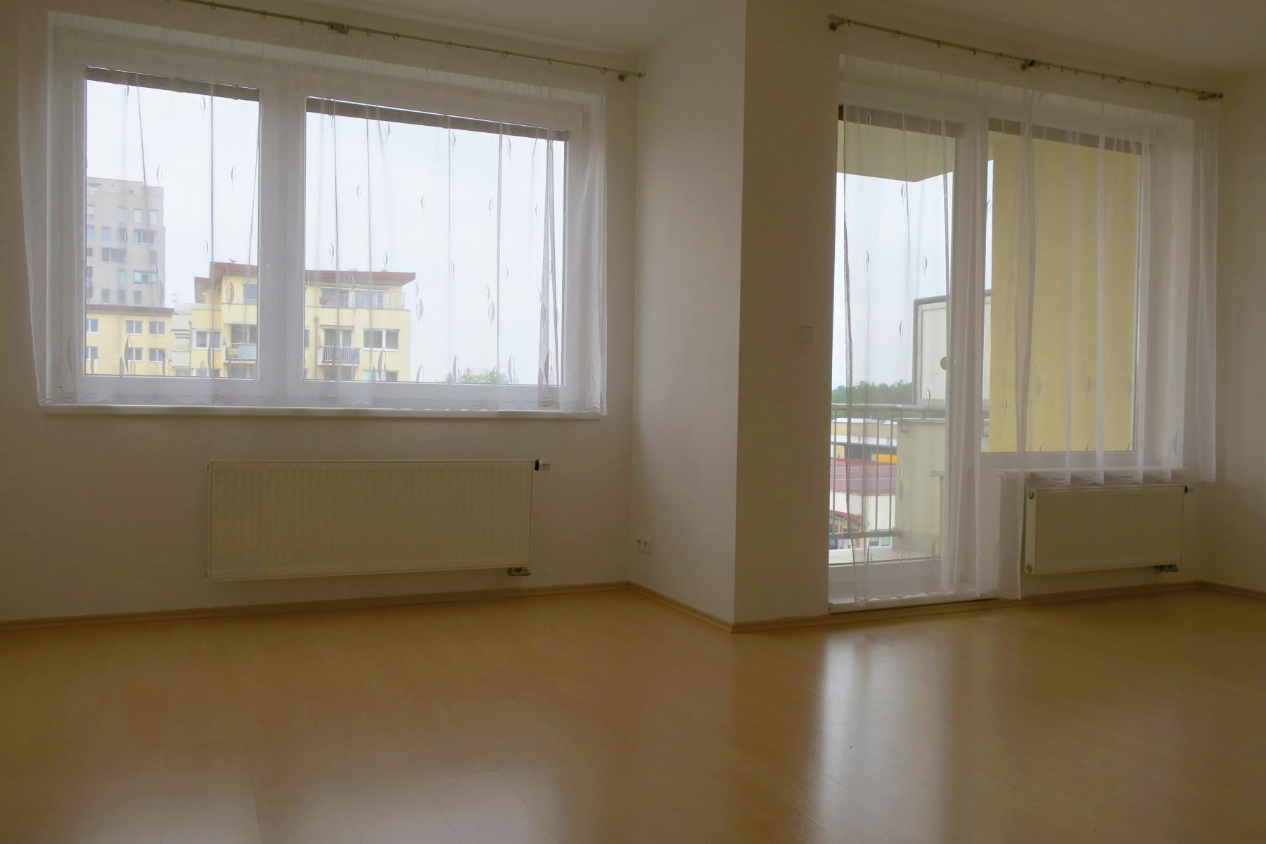 Prostorná obytná místnost s plovoucí podlahou a vstupem na balkon. Součástí je kuchyňský kout vybavený linkou se spotřebiči (lednice, el. trouba, sklokeramická varná deska, digestoř).