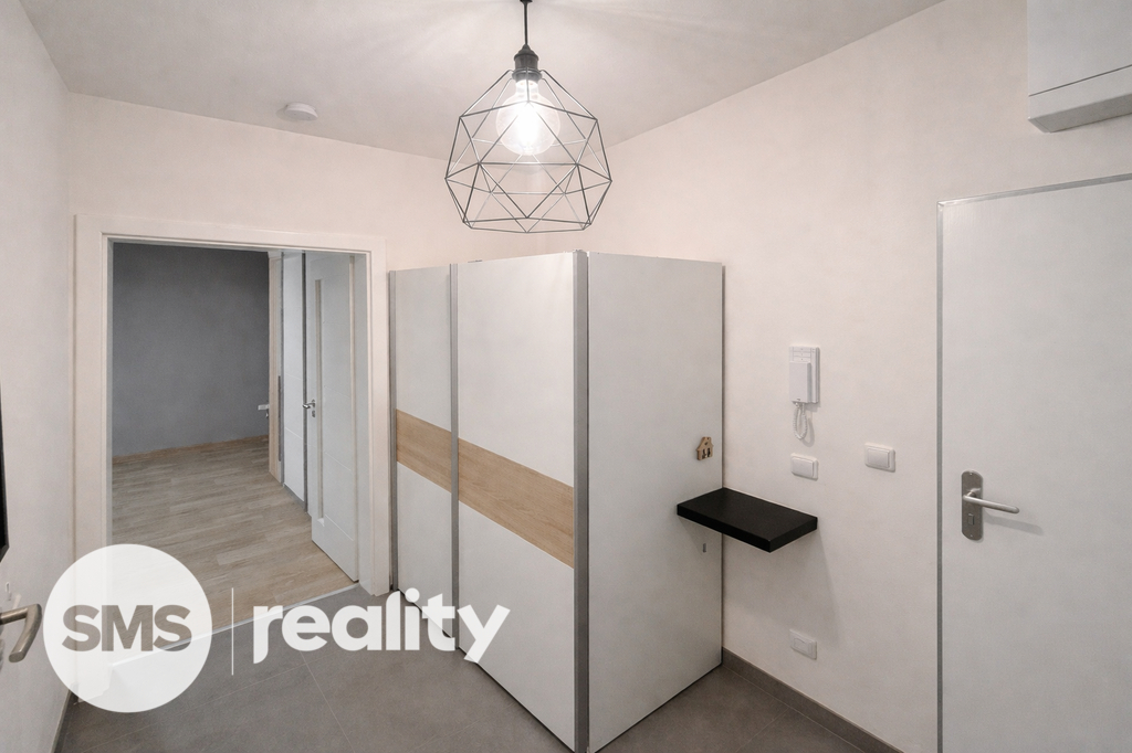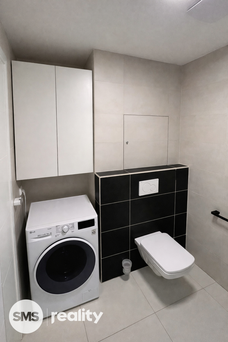 Byt je částečně vybaven: kuchyňská linka se spotřebiči (lednice, sporák, myčka), pračka, skříně, jídelní stůl.