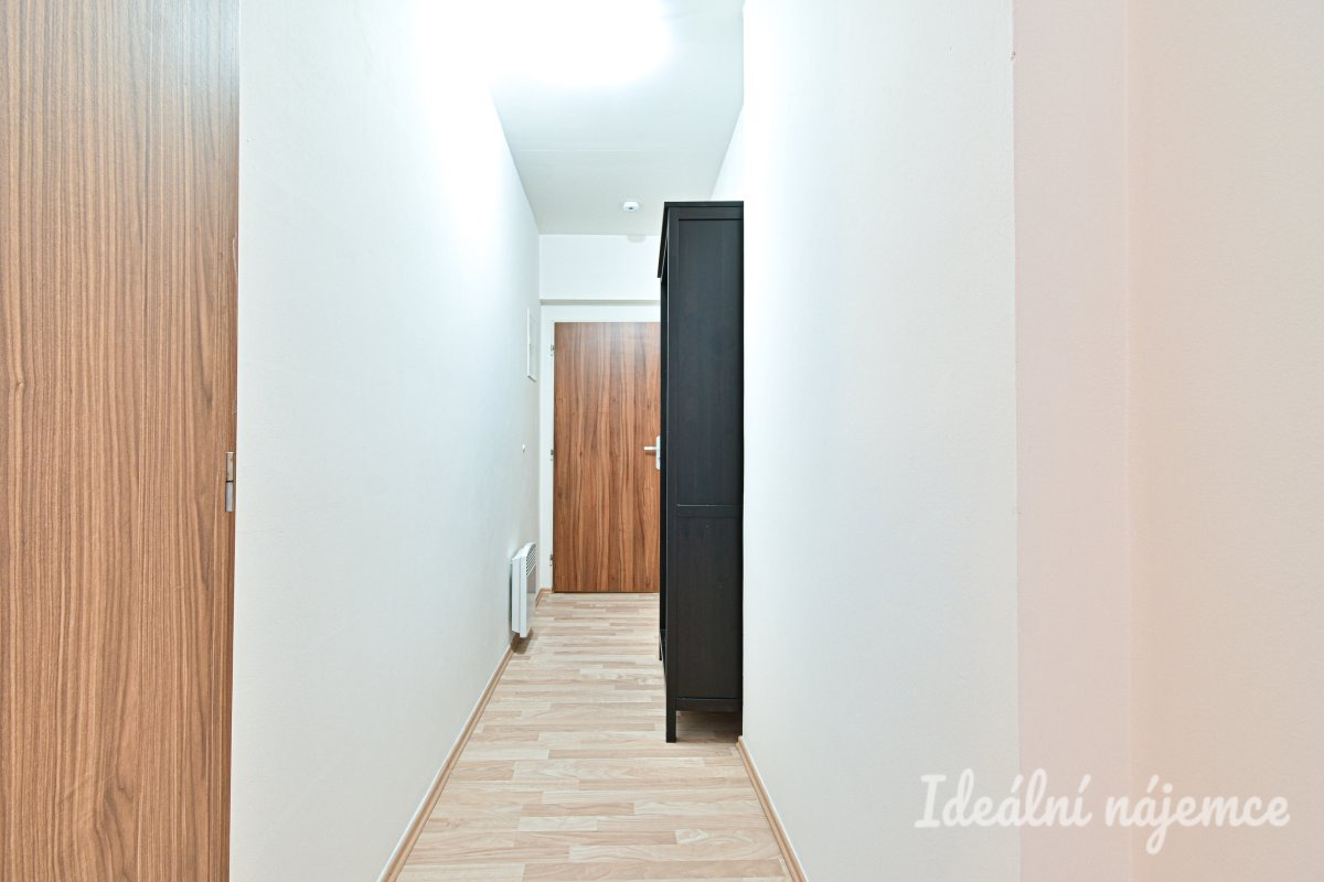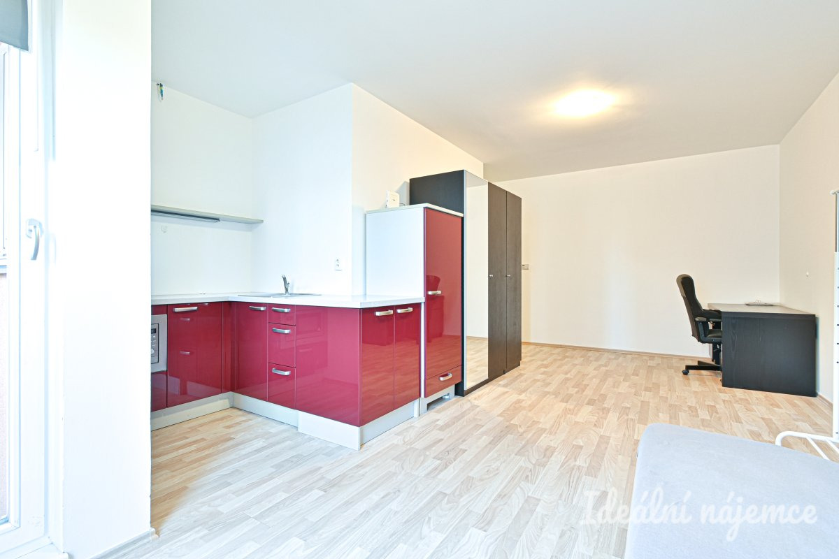 Interiér je ve velmi dobrém stavu a je připraven k okamžitému nastěhování. Dispozice 1+kk je chytře řešená – nabízí komfortní obytnou část s kuchyňským koutem a vše potřebné pro pohodlný městský život. Kuchyně je vybavena spotřebiči jako lednice s mrazákem, varná deska a mikrovlnná trouba. Zbytek obytné místnosti disponuje rozkládací postelí, šatní skříní a psacím stolem.