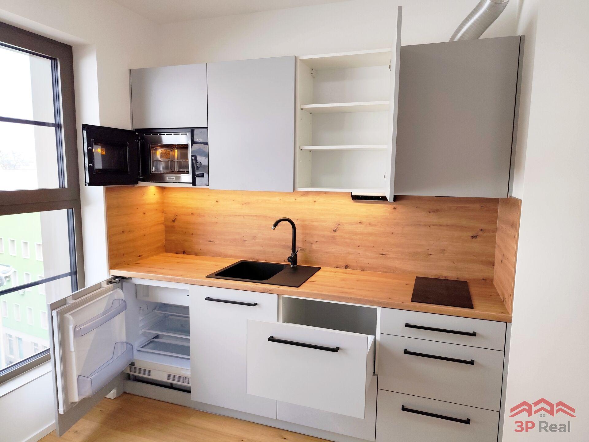Pračka, kuchyňská linka s megaskříněmi, lednička, mikrovlnka s grilem, indukční vařič – vařte jako profík, bez stresu.