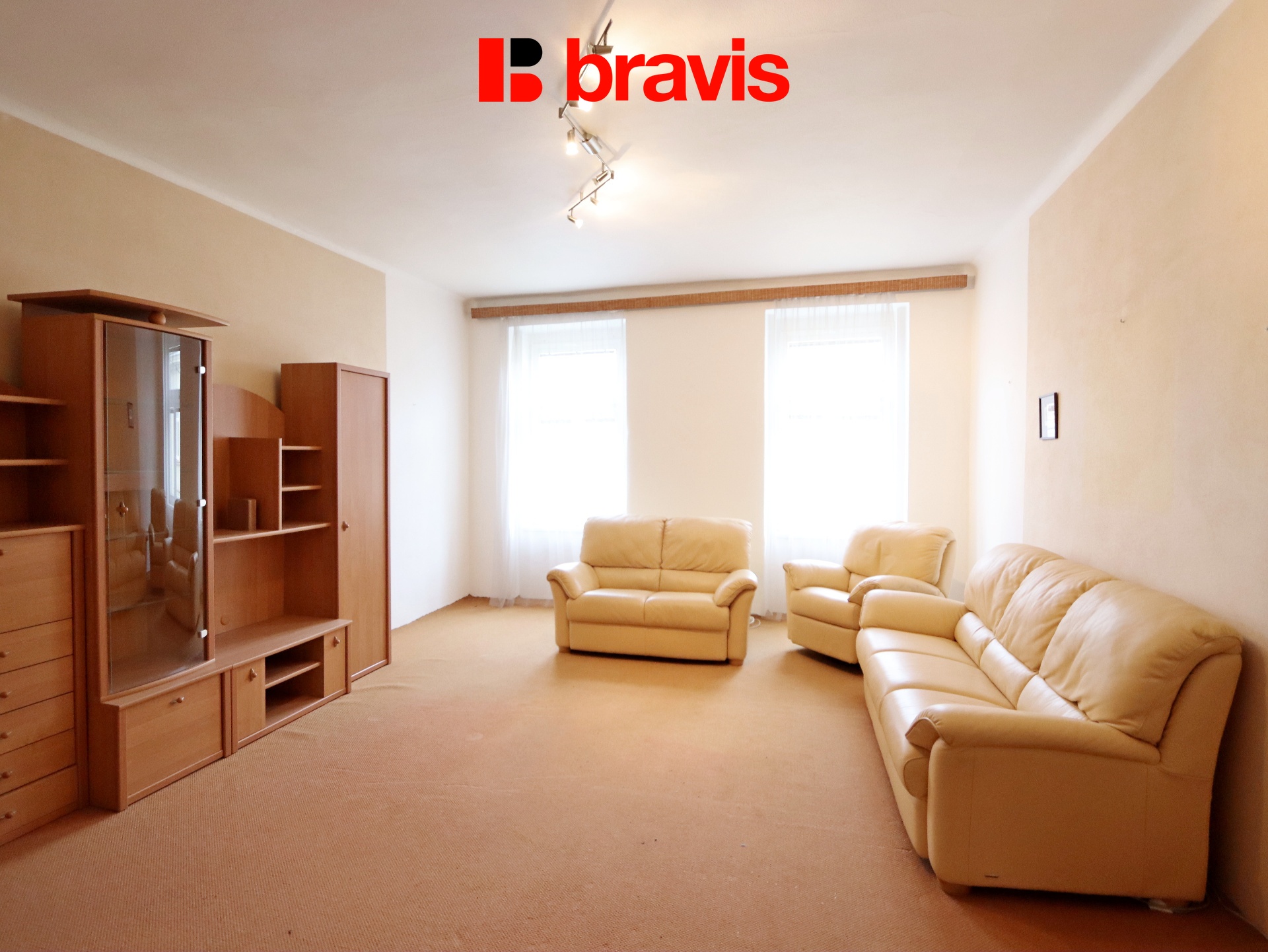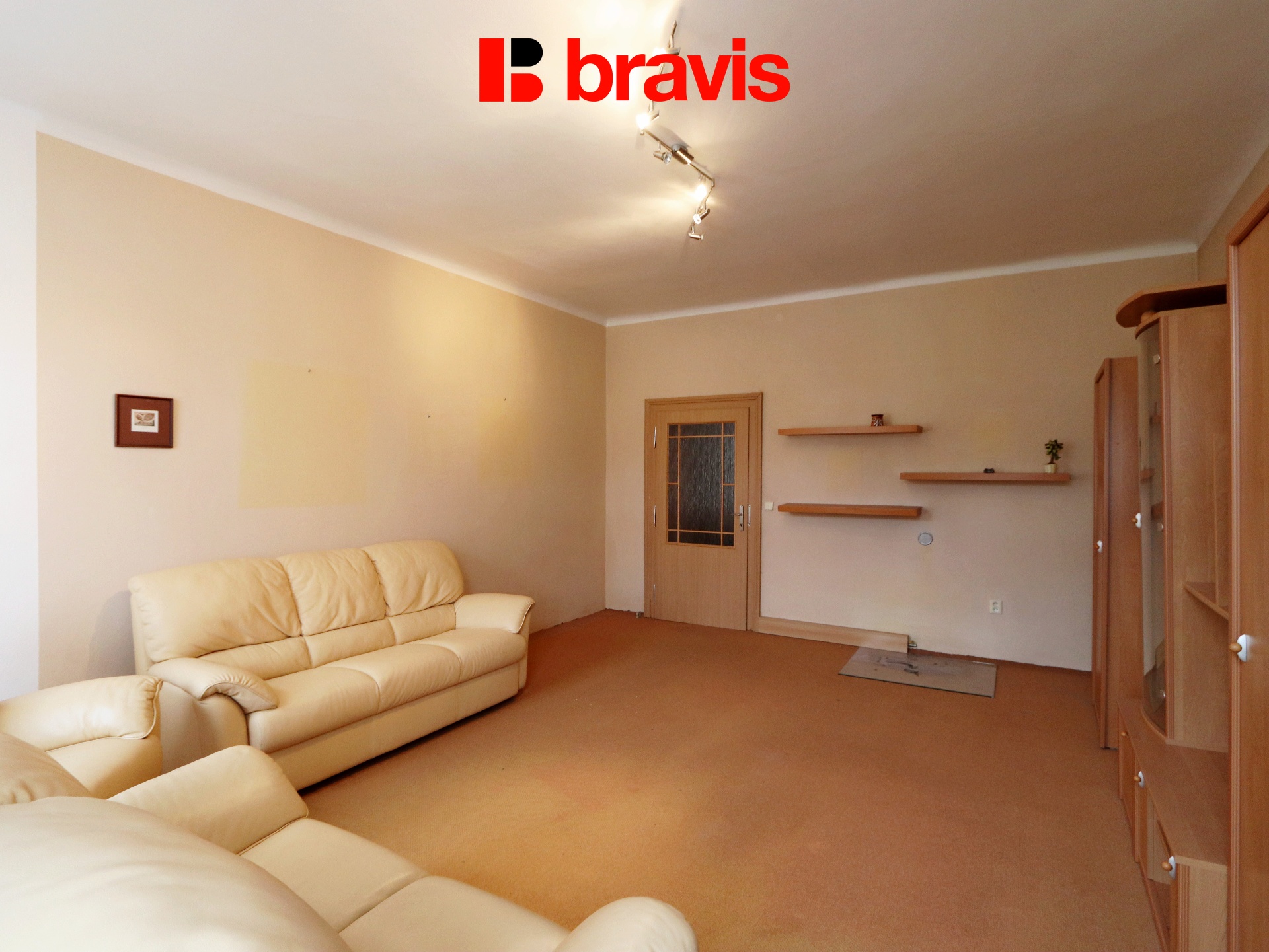 V obývací části je kožená sedací souprava a šatní skříň, je možné nábytek vyklidit. Orientace obývacího pokoje je na východní stranu.