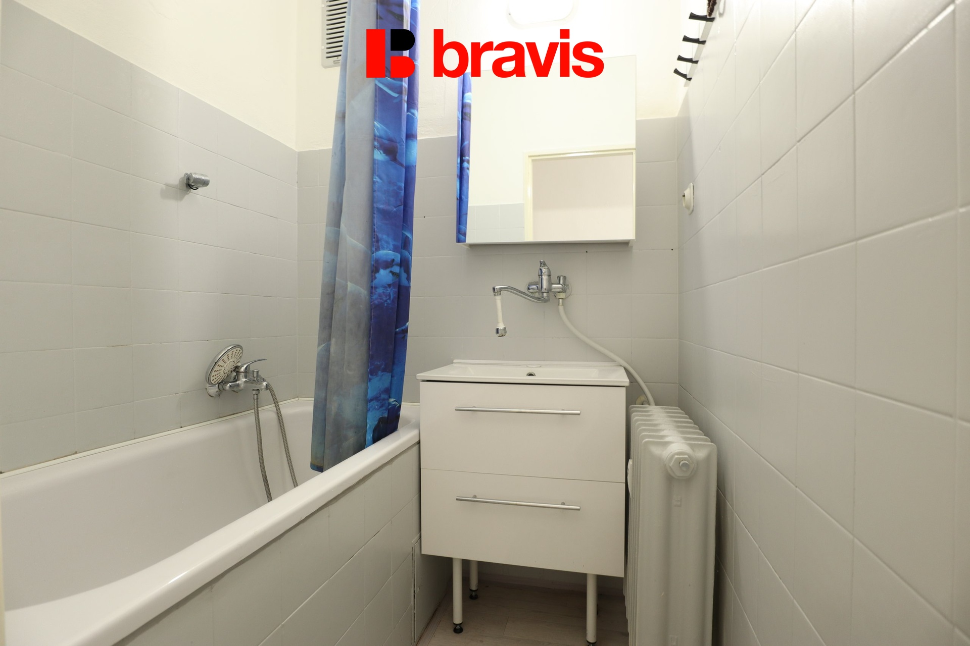 V koupelně je vana, umyvadlo s umyvadlovou skříňkou a radiátor.
