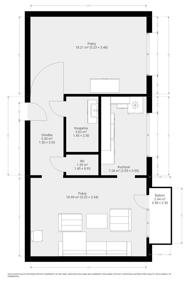 Byt sestává z prostorného obývacího pokoje se sedací soupravou, z obývacího pokoje je přístup na balkon. Samostatná kuchyně vč. spotřebičů, ložnice s vestavnými skříněmi.