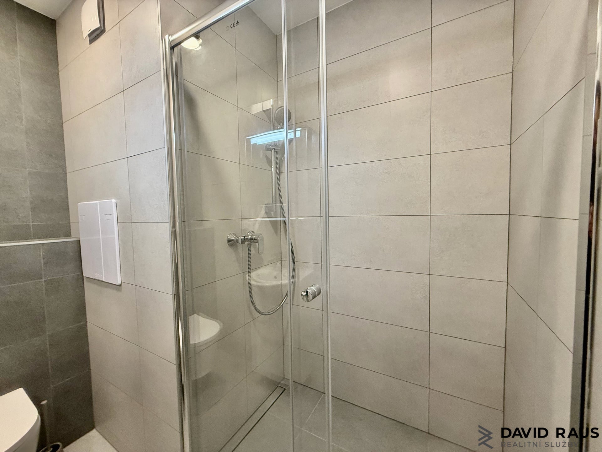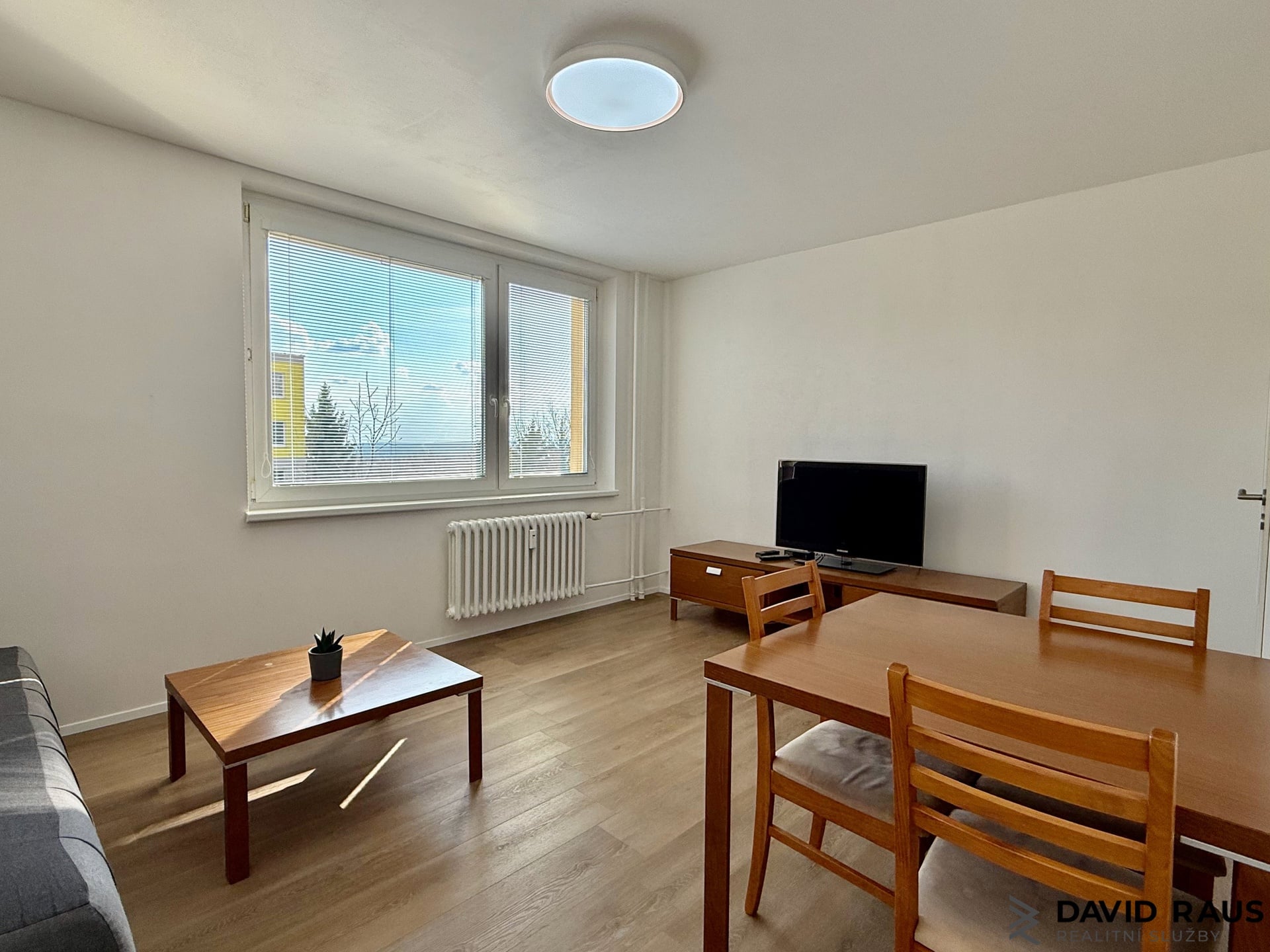 Po vstupu do bytu bezpečnostními dveřmi se ocitnete v příjemné chodbě, která je prakticky řešená a nabízí dostatek úložného prostoru. Nachází se zde velká vestavěná skříň se zrcadlem, věšáková stěna s botníkem i další úložná skříňka. Součástí chodby je také prostor pro pračku s možností umístění sušičky, což zvyšuje komfort každodenního bydlení. Z chodby je vstup do všech místností. Hlavní obytný prostor tvoří světlý obývací pokoj s kuchyňským koutem. Kuchyňská linka v moderním provedení kombinuje bílé lamino s dekorem šedého kamene a je vybavena vestavěnou troubou, sklokeramickou deskou a myčkou. Nechybí ani prostor pro mikrovlnnou troubu, přičemž lednici si nájemce může zvolit dle vlastních preferencí. Obývací část je zařízena – k dispozici je sedací souprava, konferenční stolek, jídelní stůl i TV stolek s televizí.