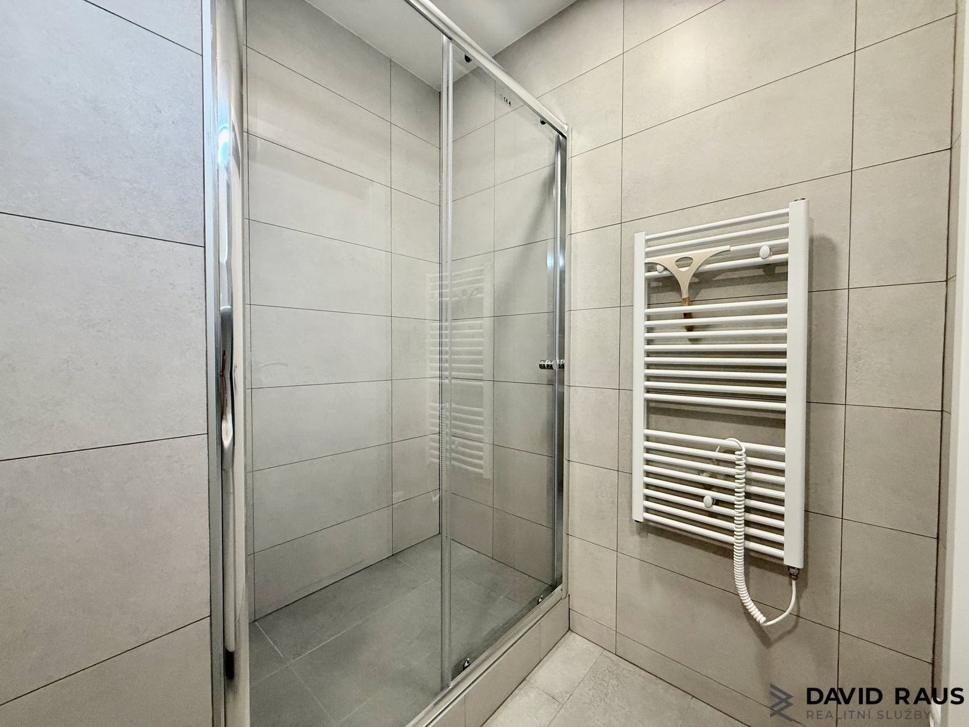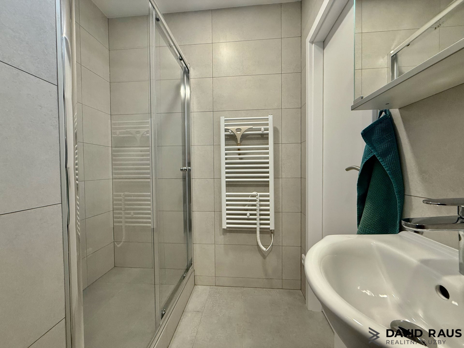 Koupelna je laděná do jemných šedých a krémových tónů a nabízí prostorný sprchový kout, závěsné WC (Geberit), umyvadlo se skříňkou a žebříkový radiátor.
