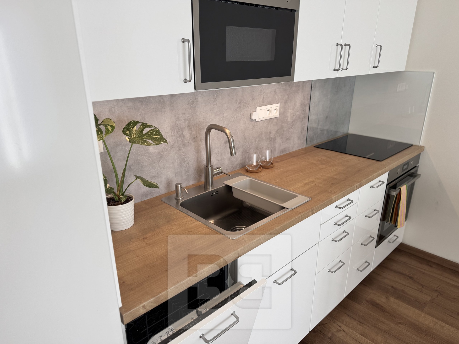 • Kuchyňská linka vč. spotřebičů (lednice, myčka, indukční varná deska, elektrická trouba, mikrovlnná trouba)