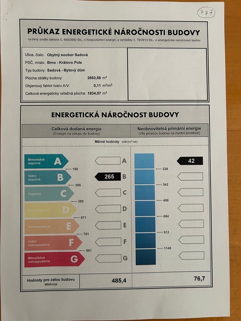 Ukazatel energetické náročnosti budovy:265 kWh/m²
