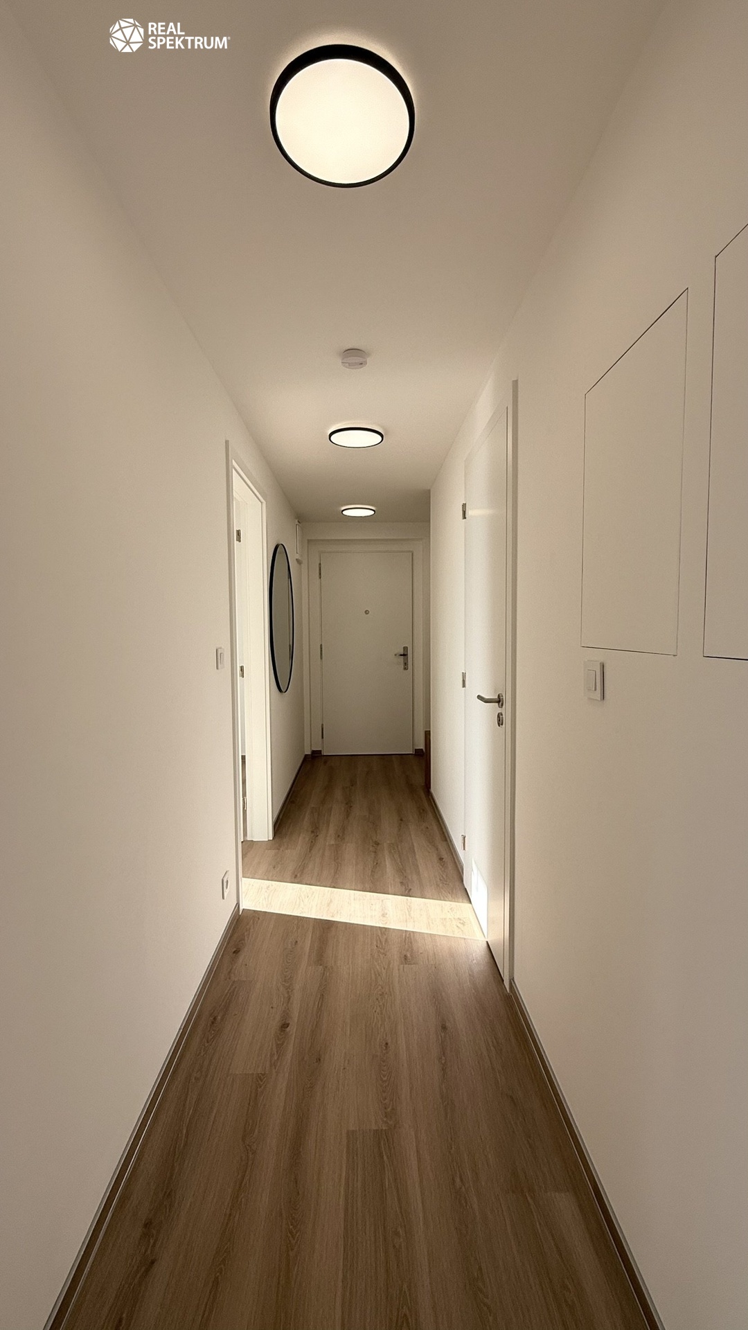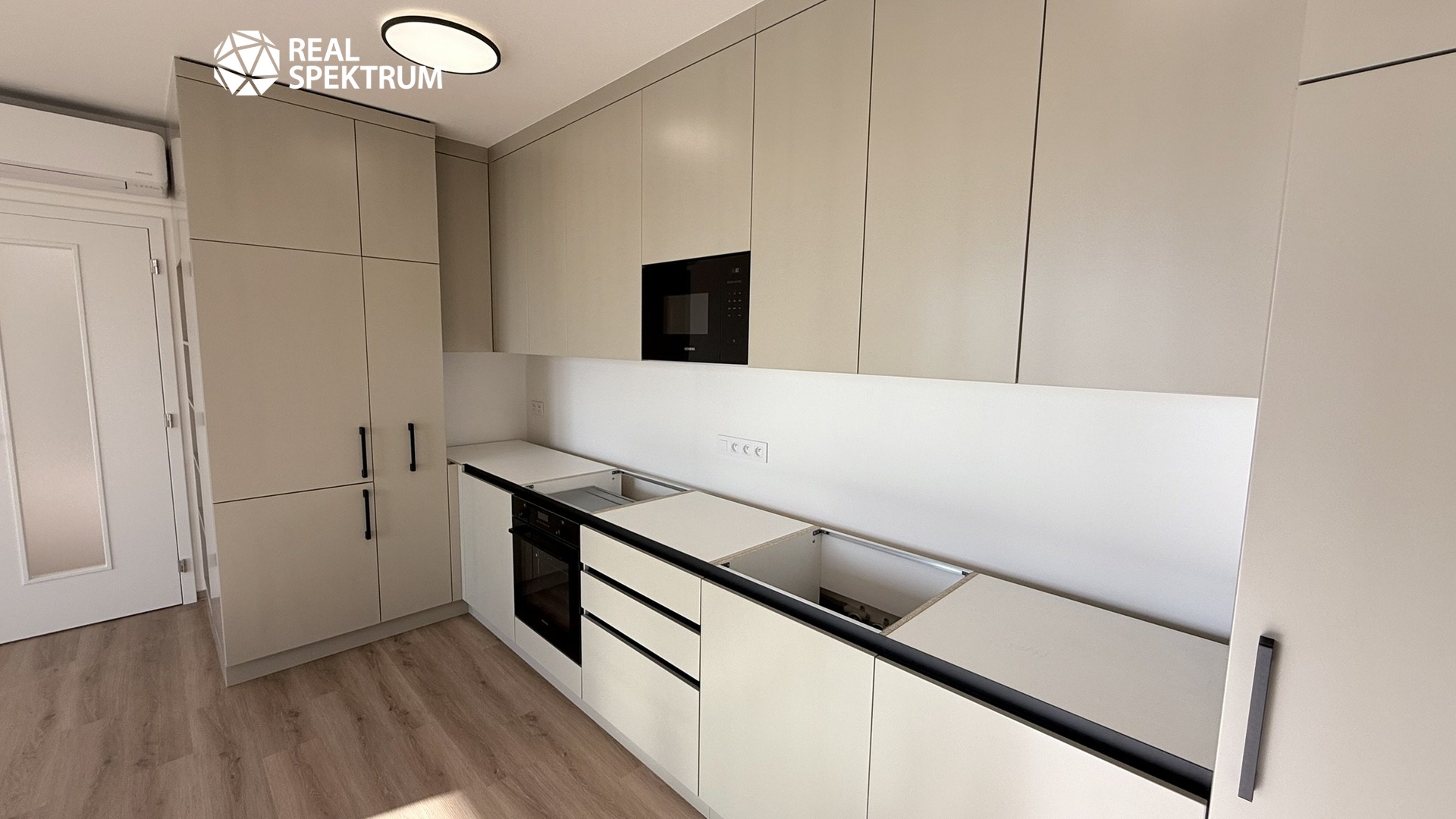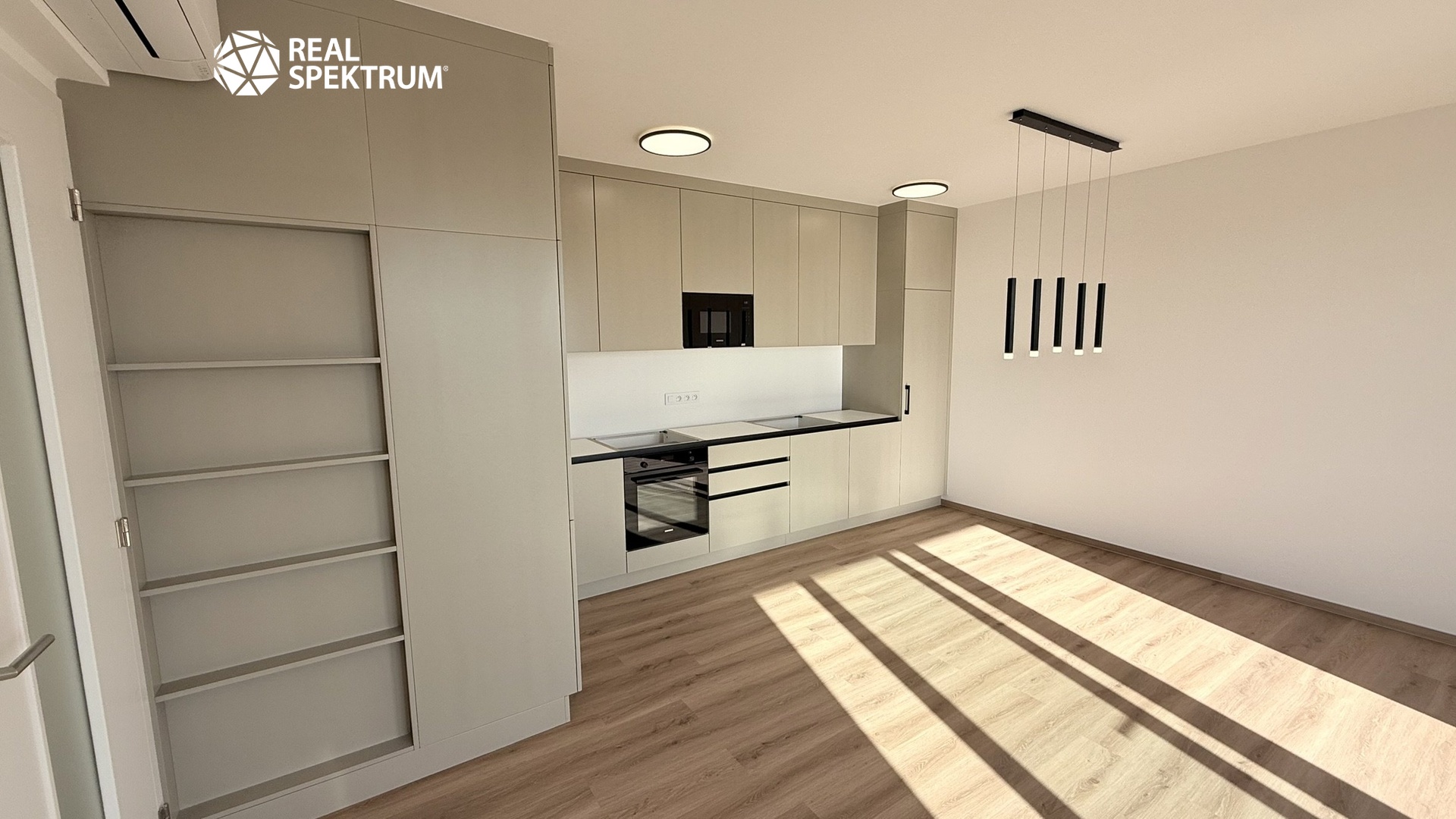 Interiér bytu nabízí vstupní chodbu se zádveřím a vestavěnou skříní, obývací pokoj je spojený s kuchyní a jídelnou. Kuchyňská linka má lakovaný matný povrch s kamennou deskou, je vyrobena na míru a vybavena kvalitními vestavnými spotřebiči značky Siemens.
