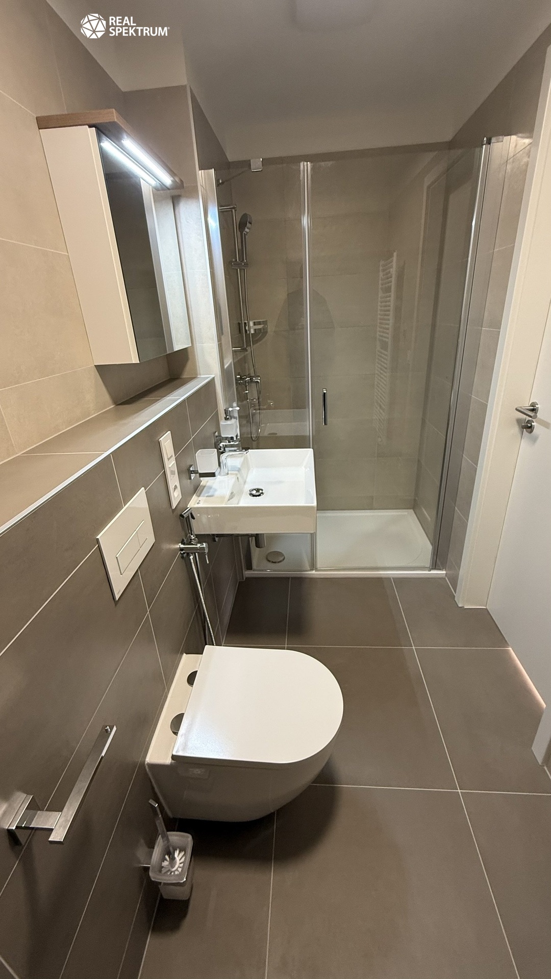 Dále je k dispozici samostatná ložnice s prostorem pro vestavné skříně a koupelna se sprchovým koutem a toaletou s bidetovou sprškou.