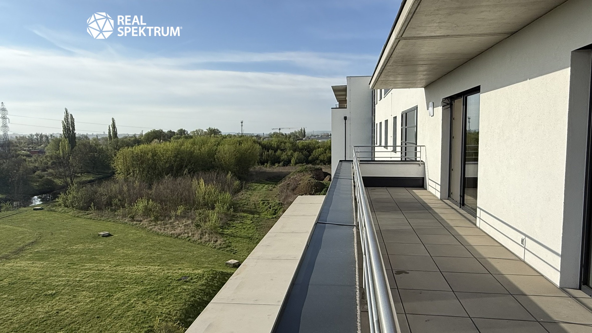 Po celé šířce bytu prochází velkorysá terasa o výměře 23,1 m², kde se najde místo pro relaxaci, posezení s přáteli i pěstování bylinek. Přístup na terasu je z každého pokoje, výhledy směřují k řece a do klidného prostředí s cyklostezkou.