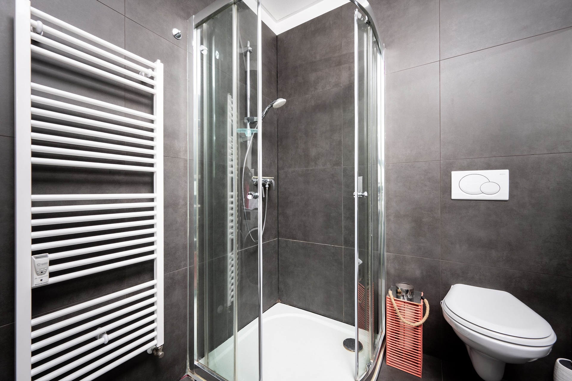 V koupelně s toaletou je sprchový kout, pračka se sušičkou a topný žebřík.