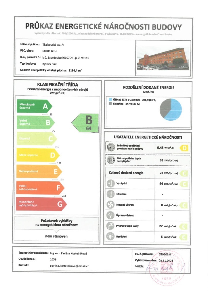 Ukazatel energetické náročnosti budovy:64 kWh/m²