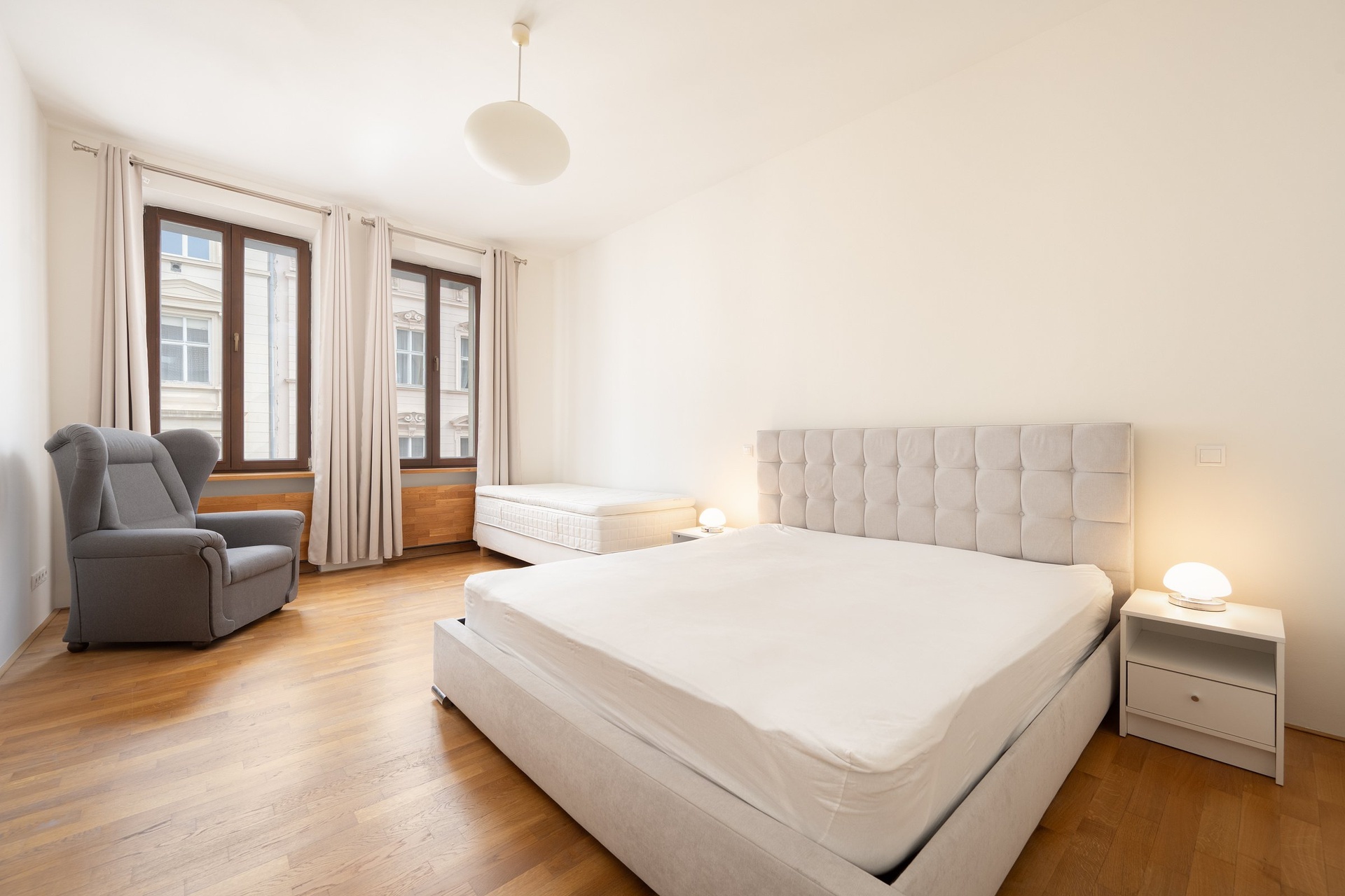 • Ložnice: Velkorysý pokoj orientovaný do ulice, vybavený manželskou postelí, nočními stolky, lampičkami, samostatným lůžkem a křeslem. Součástí je vestavěná šatní nika. Prostor umožňuje i pracovní využití.