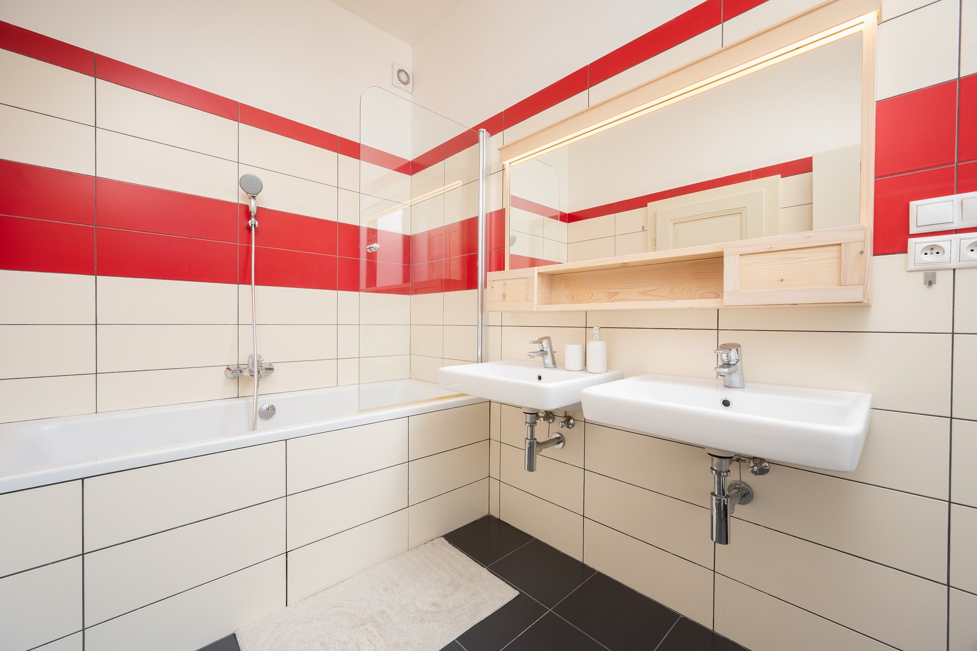 • Koupelna: Orientovaná do klidného vnitrobloku, vybavená vanou se sprchovou zástěnou a dvěma umyvadly.