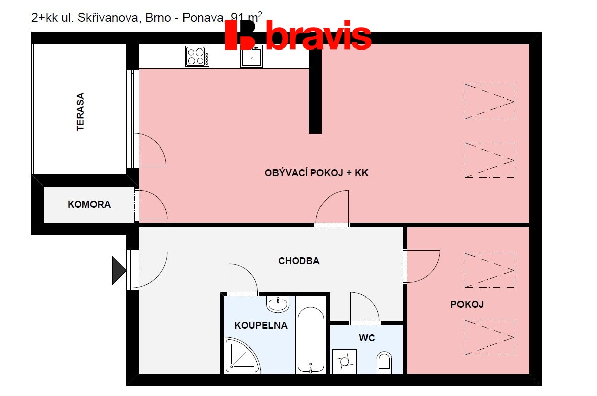 Pronájem bytu 2+kk, 91m² Brno - Královo Pole, ul. Skřivanova, zařízený, terasa, komora