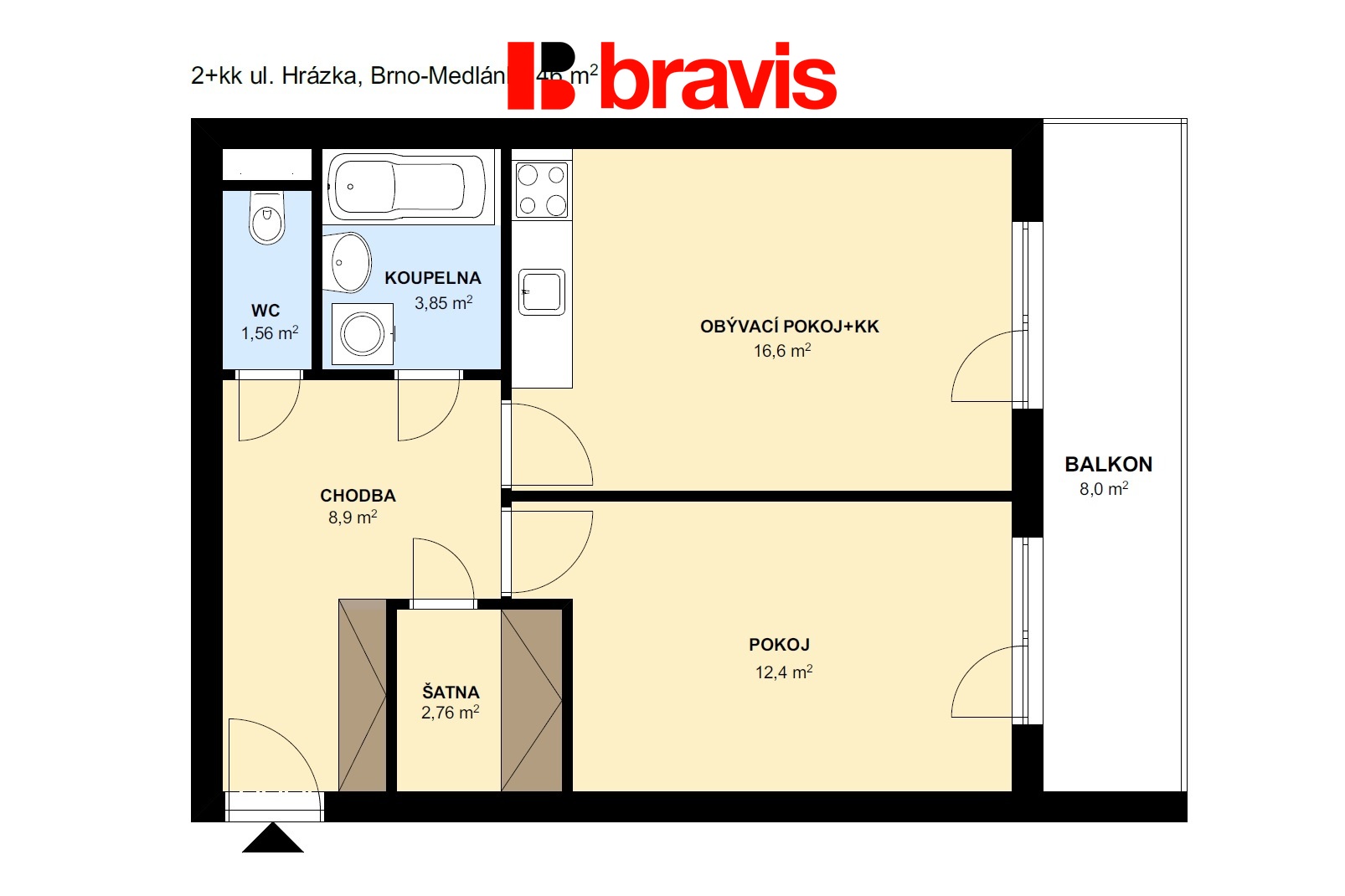 Byt je jihozápadně orientovaný a velmi slunný. Z obou pokojů je přímý vstup na prostorný balkon, kde si můžete vychutnat ranní kávu i večerní posezení s výhledem.