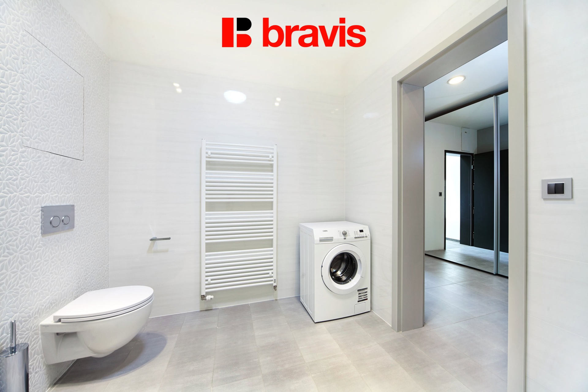 Koupelna je vybavena sprchovým koutem, umyvadlem, zrcadlem s osvětlením, topným žebříkem, toaletou a pračkou.