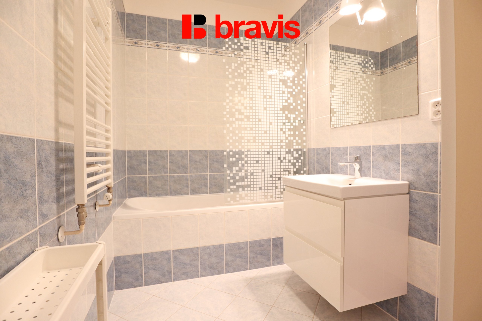 V koupelně se nachází vana, umyvadlo a umyvadlová skříňka, otopný žebřík a přípojka na pračku.