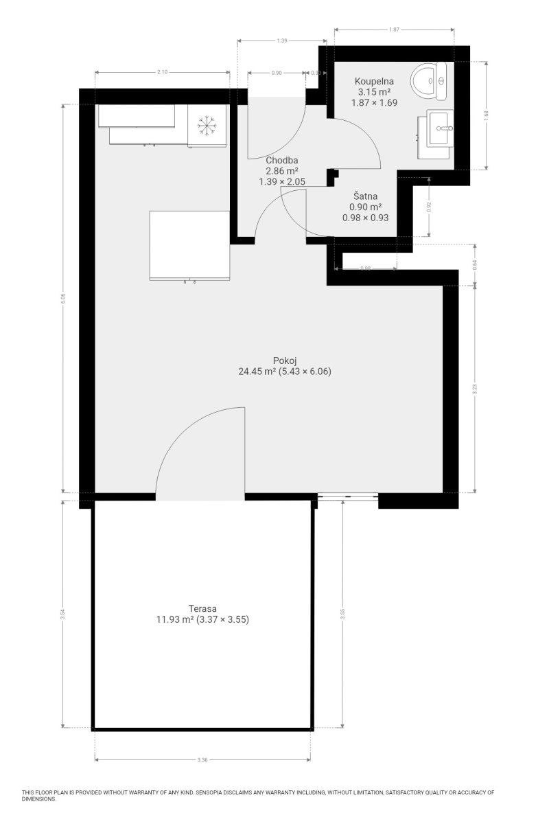 Byt se nabízí vybavený dle fotografií. Kuchyňský kout je součástí obytného prostoru a navazuje na obývací část. Spací prostor je nyní řešen otevřeně, nicméně v případě zájmu je možné na náklady majitele dodělat dveře tak, aby byl spací prostor plnohodnotně oddělen a vznikla samostatná ložnice. Koupelna je vybavena sprchovým koutem, toaletou, umyvadlem a pračkou. Součástí bytu je také prostorný balkon, který poskytuje příjemné místo k posezení.