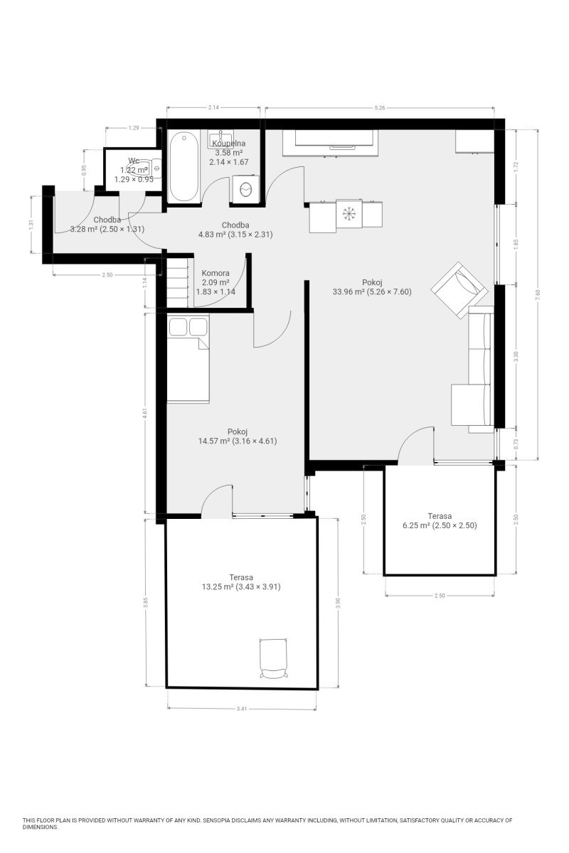 Byt se nabízí částečně vybavený. Kuchyňský kout disponuje linkou se spotřebiči jako lednice, varná deska, digestoř, mikrovlnná trouba. Z obývacího pokoje vstup na balkon. Ložnice vybavena postelí a součástí ložnice je i vstup na terasu. Prostorná koupelna s vanou, umyvadlem, pračkou a topným žebříkem je od toalety oddělena. Velkou výhodou je komora přímo v bytě.