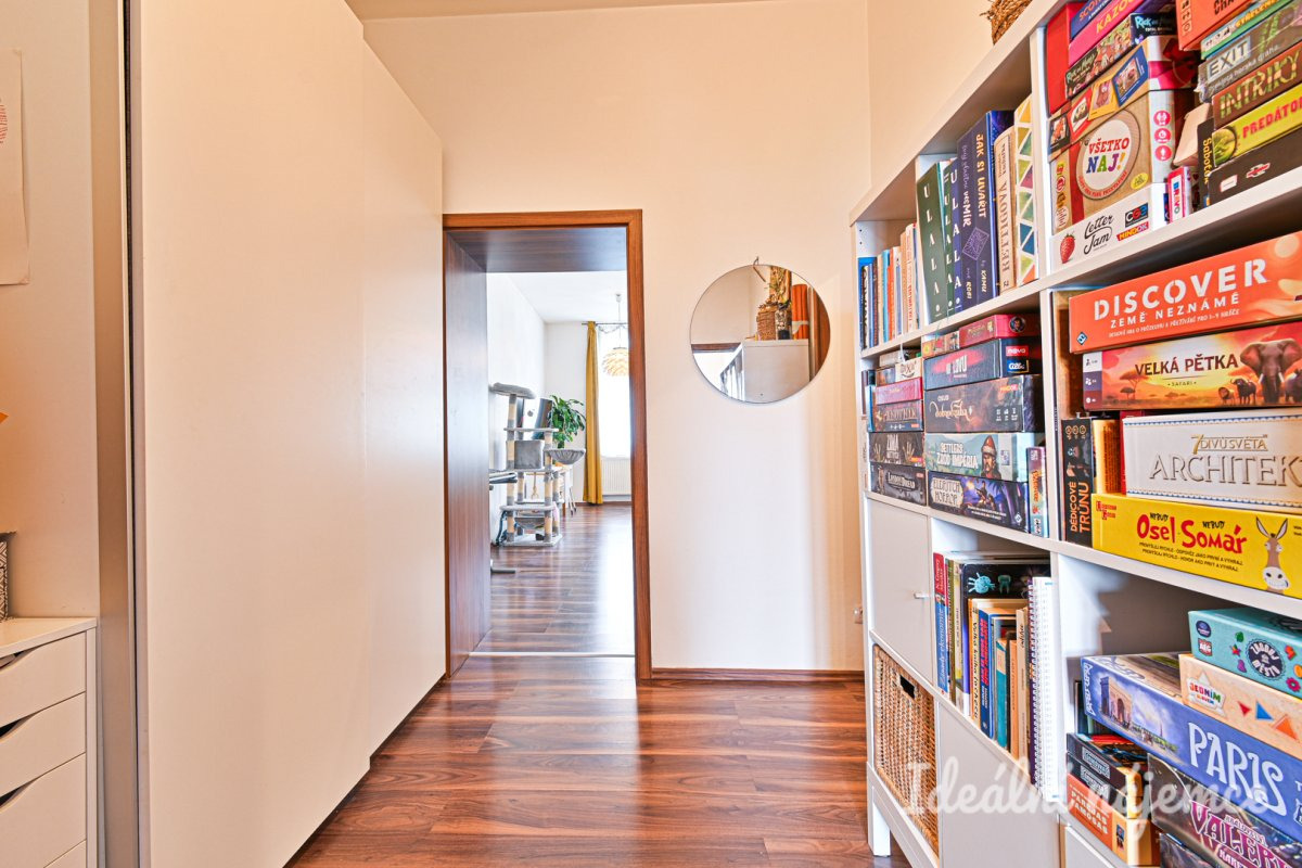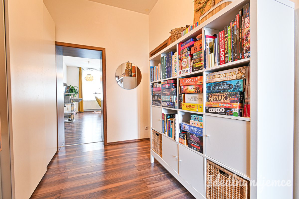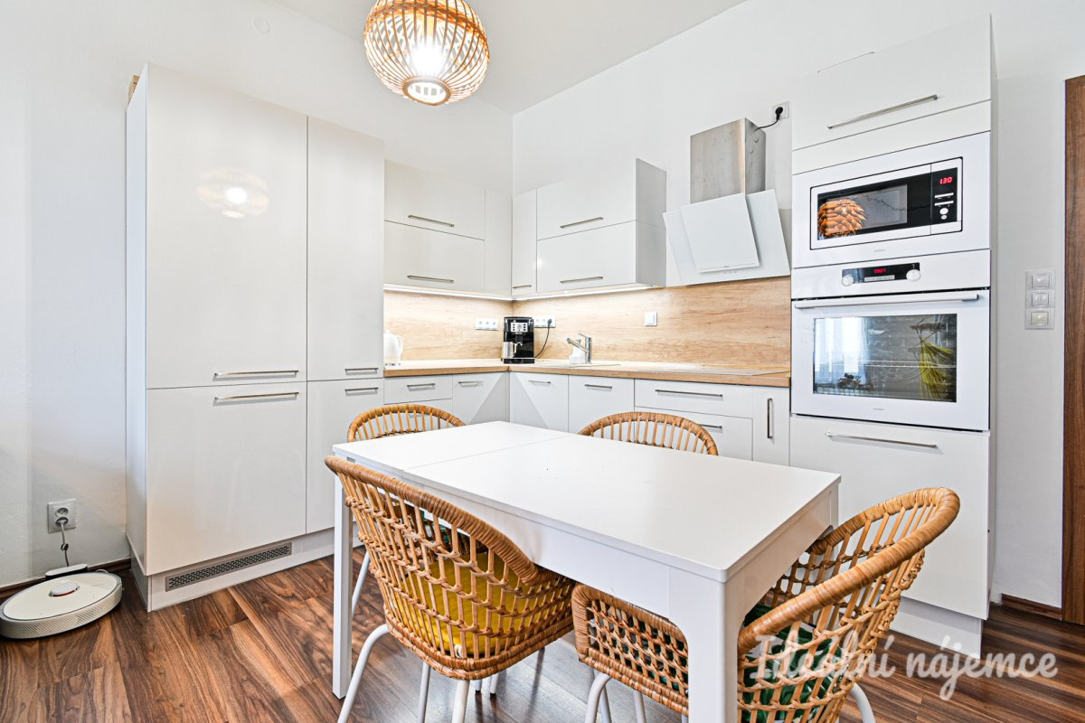Byt se nabízí částečně vybavený dle fotografií. K dispozici zůstává jídelní stůl, gauč, vestavěné spotřebiče (lednice, myčka, varná deska, trouba), pračka a sušička. V koupelně navíc zůstane regálek a koš na prádlo, v obýváku police a konferenční stolek u gauče.
