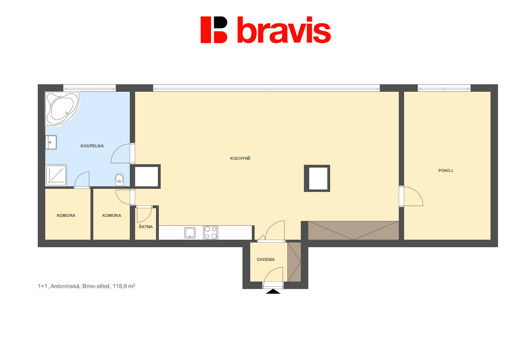 Pronájem bytu 2+kk ul. Antonínská, Brno střed, šatna, komora, 122 m2
