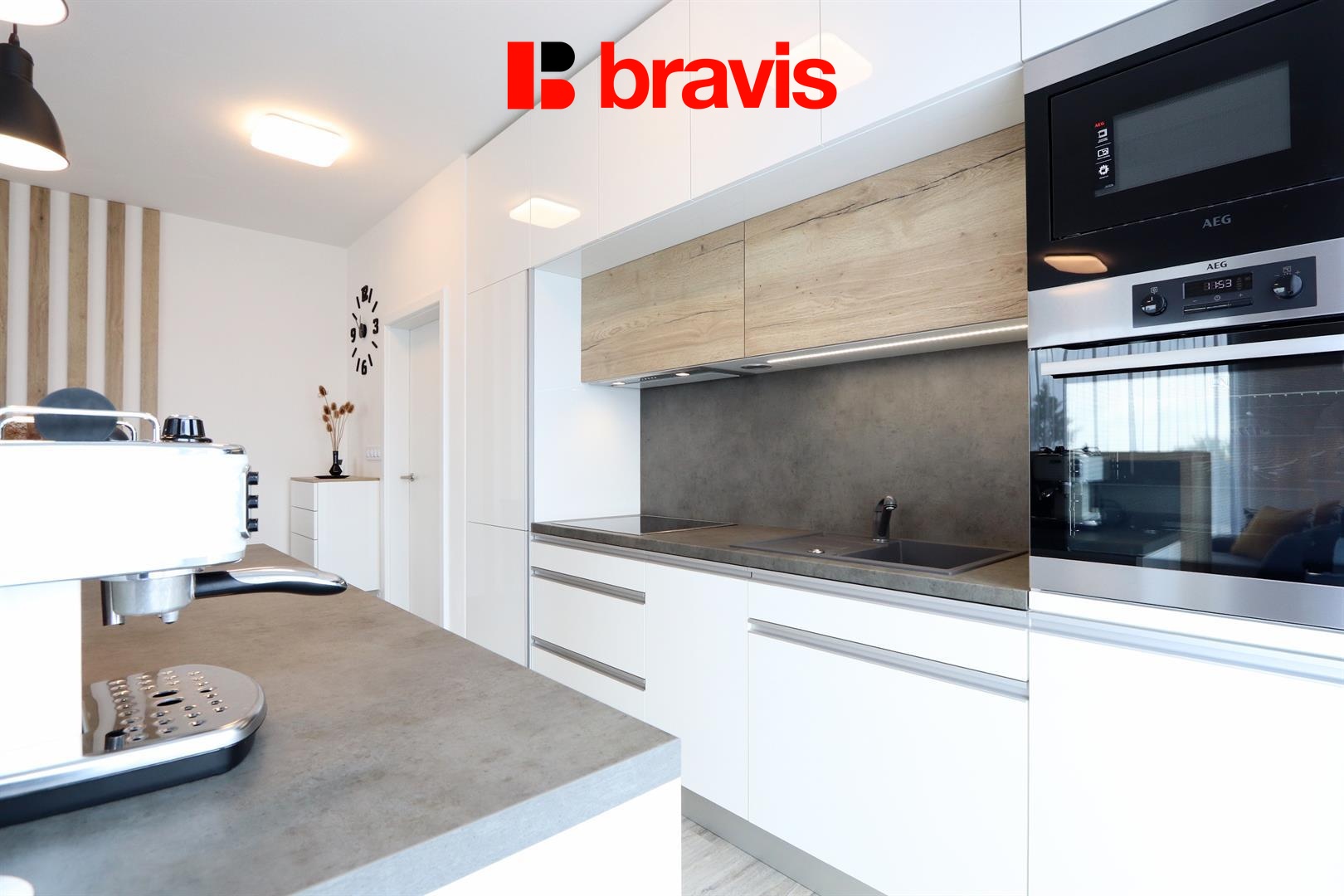• vestavné spotřebiče značky AEG (indukční varná deska, horkovzdušná trouba, mikrovlnná trouba, myčka, chladnička s mrazícím boxem)