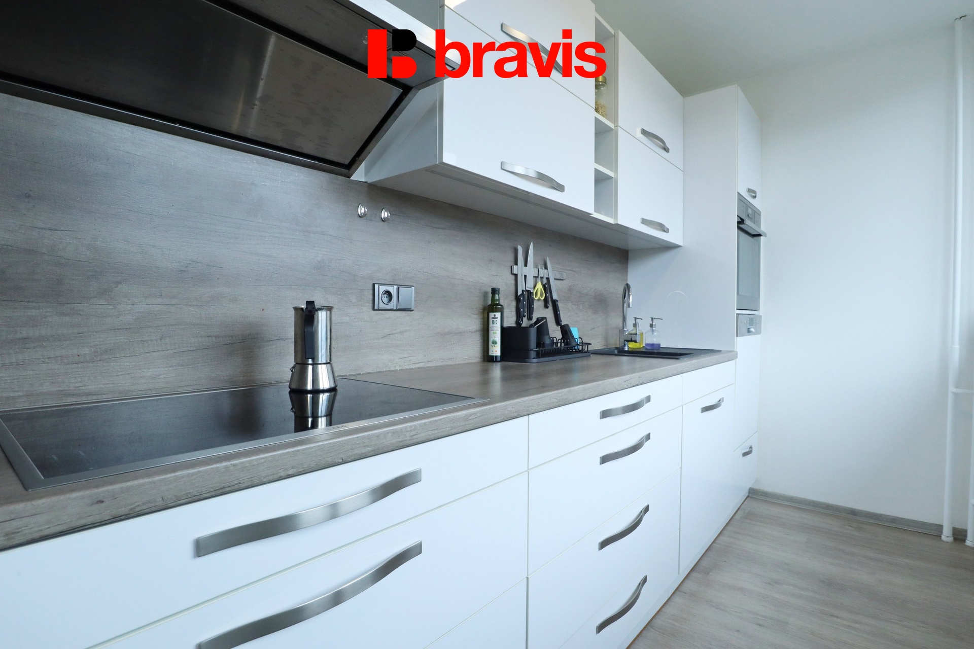 Kuchyň je plně vybavena moderními spotřebiči – k dispozici je lednice s mrazákem, trouba, indukční varná deska, digestoř a myčka. Nabízí také dostatek úložného prostoru i pracovní plochy pro pohodlnou přípravu jídel.
